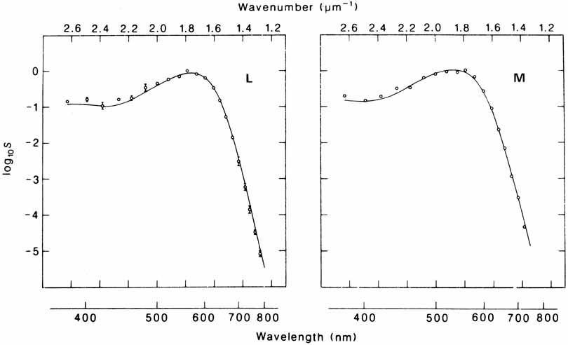 The first approach involves the measurement of spectral sensitivities of human color defectives known as dichromats. Based on the assumption that these people lack one of the normal subject's three mechanisms and further that (like normal subjects) they also lack the S cone mechanism for very small targets at the fovea, it has been assumed that the dichromat's sensitivity at the central fovea is determined largely by one mechanism. The protanope (lacking L cones) was assumed to have only the M cone mechanism, and the deuteranope only the L cone mechanism. Willmer and Hsia and Graham used this approach to identify two mechanisms with broad overlapping spectral sensitivities that peaked at about 540 and 580 nm (Fig. 9).35,36 These results are essentially in accord with the analysis made by Pitt of the color-matching functions of dichromats.37 Later, Blackwell and Blackwell measured the S cone mechanism in blue-cone monochromats, color-blind subjects who lack functional M and L cones.38 These monochromats had a peak sensitivity at 440 nm. The second approach involves the use of chromatic adaptation of normal subjects. It is based on the assumption that the sensitivity of one or two of the normal trichromat's mechanisms can be reduced by exposure to certain colored backgrounds, leaving the remaining mechanisms relatively more sensitive to determine spectral sensitivity. Such experiments identify color mechanisms peaking at about 540 and 570 nm, agreeing reasonably with the functions found in dichromats.35,39 Undoubtedly, the most extensive application of the chromatic adaptation technique has been applied by Stiles.40–43 He measured threshold responses to spectral lights against relatively low-intensity monochromatic backgrounds and isolated a number of spectral sensitivity curves (π mechanisms). Three of the mechanisms peaked at 440, 540, and 580 nm and probably reflect the activity of the S, M, and L cones, respectively. Using a similar technique but with more intense colored backgrounds, Wald basically confirmed the Stiles results.44 Wald argued that his three functions were estimates of the absorption spectra of the cone pigments and that three of Stiles' π mechanisms also were measures of the sensitivity of the cone mechanisms. Color defectives and chromatic adaptation have each played an important role in the psychophysical inference of the cone spectral sensitivities in humans. At first glance it may seem surprising that we are able to measure the spectral sensitivity of a receptor type in color normal subjects, given that almost all second-order and subsequent neurons receive inputs from more than one cone type. The reason we can achieve relative isolation is that a strongly colored field will differentially adapt various cone types leaving one type substantially more sensitive than the others (see later). In the absence of strong chromatic adaptation, when a neutral (white) adapting field is used, the spectral sensitivity of the eye to increments reveals the antagonistic interaction between cones that characterize the opponent stage of color processing.45–47 |