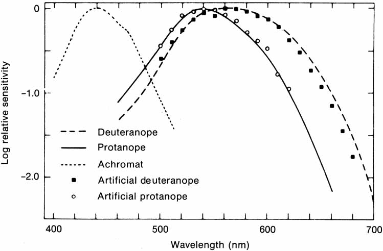 color defectives). HUE DISCRIMINATION There are two regions of the visible spectrum in which the ability to discriminate between adjacent wavelengths is at a maximum for normal eyes (Fig. 13). In these two regions, approximately 490 and 590 nm, there need be only a 1- or 2-nm difference between wavelengths for them to be seen as different! Wavelength discrimination (hue discrimination) is less acute in the middle of the spectrum and deteriorates rapidly at the ends of the spectrum. These measurements typically are made by comparing two adjacent patches of essentially monochromatic light (usually half fields of a circular patch) in which the two colors are carefully equated in brightness so that brightness differences do not form the basis of the discrimination. As Wright has pointed out, the curve has the characteristics that might have been anticipated from looking at the spectrum (as was demonstrated at the beginning of the chapter).54 The part of the spectrum in which maximum wavelength discrimination occurs is where the colors appear to be changing most rapidly. In the yellow region (590 nm), there is a rapid change to red on one side and green on the other; in the blue–green region (490 nm), there is a rapid change to blue on one side and green on the other. To distinguish lights that differ only in wavelength, the ratio of each of the cone receptor outputs must be compared for the two lights. One might consequently expect this ratio to be changing most rapidly in the spectral region in which the spectral sensitivity functions intersect or are changing most rapidly with respect to each other. As expected, “cross-points” are close to the spectral regions where the best hue discrimination occurs. In color-vision defectives who lack a cone pigments and therefore lack one of the crossing points, there is the expected loss of hue discrimination in that spectral region. Typical hue discrimination curves for severe color defectives are also shown in Figure 13. Notice that dichromatic wavelength discrimination is considerably worse than for normals and only approaches the normal value in the normal's blue–green (490 to 500nm) region of the spectrum. The red–green dichromat (protanope and deuteranope) is essentially a monochromat for wavelengths greater than 530 nm, which results in greens, yellow, oranges, and reds being indistinguishable in many situations. The anomalous trichromat, whether protanomalous or deuteranomalous has a similar but less severe deficiency in wavelength discrimination ability in the same region of the spectrum. The anomalous trichromat may have wavelength discrimination close to that of the dichromat (extreme anomaly) or almost identical with that of the normal eye (simple anomaly). These facts could have been predicted from the presumed physiology of the color defectives. Protanopes and deuteranopes appear to lack one of the three cone pigments—L and M, respectively. Consequently, for wavelengths greater than approximately 530 nm, there is only one cone photopigment being stimulated, leaving the dichromat in a monochromatic state for that region of the spectrum. The remaining cone pigments provide a basis for hue discrimination for wavelengths shorter than 530 nm. Anomalous trichromats probably have two of their three photopigments with peak wavelength sensitivities close together on the spectrum.55 The extreme anomal, whose color vision is similar to that of a dichromat, has two photopigments for the medium- and long-wavelength spectral regions whose peak sensitivities differ only by a few nanometers. Consequently, this will result in large portions of the spectrum producing similar ratios of stimulation for the two photopigments with an accompanying loss of wavelength discrimination. Although less well studied, the hue discrimination with tritan defects fits the predictions based on the absence or displacement of the S (blue) photopigment; short wavelength discrimination is poor, and the best wavelength discrimination is found at approximately 570nm. LUMINOSITY The lightness or brightness of a color depends largely on the relative luminous efficiency of the component wavelengths. Under daylight or photopic light conditions, a given brightness response is produced with the least amount of incident energy in the middle of the visible spectrum. A number of experiments have shown that the normal eye has a peak luminosity function at approximately 555 nm and that luminosity falls off toward the ends of the spectrum. Under scotopic or rod-dominated light conditions, the most luminous-efficient wavelengths are closer to 507 nm. The wavelength shift of maximum luminosity from photopic to scotopic viewing is the so-called Purkinje shift. Figure 14 shows the relative luminous efficiency for these two conditions. The curves form the basis of light units (photometric and scotometric, respectively) that are used internationally. The spectral luminosity function for color defectives can be compared with that for normals (Fig. 14). Some color defectives who lack the L cone photopigment (protanopes) or have it displaced in the spectrum (protanomalous trichromats) have an abnormal spectral luminosity function and consequently perceive long wavelengths as very dim, compared with the way they are perceived by the normal eye. Many find difficulty in seeing deep-red lights in some light-emitting diode displays of hand-held electronic calculators or in seeing brake lights on automobiles during daytime driving. Cole and Brown have shown that protanopes, because of this intensity loss, have longer reaction times than normal to red traffic signals.56 These individuals find the international system of specifying light units inappropriate. Different colored lights (e.g., red and green) specified as being of equal luminance (eg, 10 cd/m2 each) will have very different brightness to their eye. All other color defectives appear to have essentially normal luminosity, although there