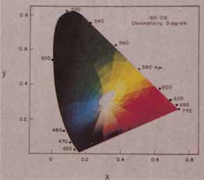 TRICHROMACY OF NORMAL VISION The fact that the normal human eye can match any color by the mixture of three other colors (none of which can be mixed to match the third “primary” color) is what leads to the conclusion that normal vision is trichromatic. James Clerk Maxwell in 1855 provided the first quantitative data on trichromacy. He used a spinning top to additively mix colors and determined the relative amounts of various primaries needed to match a reference white.5 It should be clear that trichromacy is an empirical finding and it implies that there are three fundamental variables or channels, the relative outputs of which determine our color matching behavior. It does not state that there are three cone pigments, although this is certainly an appealing and simple connection to make. Conceptually one will not go far wrong in making this connection. A more recent approach is to use a fixed set of primaries and to determine the relative amounts of each needed to perfectly match all visible wavelengths in turn. In 1931 a set of color mixing data was adopted by the CIE (Commission Internationale d'Eclairaige) as the Standard Colorimetric Observer with red, green, and blue color primaries (RGB) This was the first step in deriving an internationally recognized color system based on human visual performance. The CIE 1931 RGB system could be used to specify colors as seen by the human eye. The amounts of these three RGB primaries allowed specification of the color matches of the monochromatic wavelengths across the spectrum assigning them “tristimulus values.” In specifying any colors the relative amounts of these primaries (r, g) required to match a color can be used to generate a two-dimensional chromaticity plot. In the RGB system of colorimetry, some colors have a negative chromaticity coordinate. This tends to occur when attempting to make a match to many blue–green lights. However, conversion of one set of primaries to another is simply matrix algebra and there are solutions in which the color matching functions are all positive. In these cases, the primaries lie outside the spectral locus, which means that they are unrealizable or imaginary primaries. This has been performed by the international community with the CIE 1931 XYZ system. It has no negative numbers. The XYZ system has one further feature. The spectral shape of the tristimulus values of the Y primary, for the equal energy monochromatic spectrum, was chosen to match the CIE 1924 luminosity curve. Consequently, two samples with same Y tristimulus values are defined as having equal luminance, regardless of their Z and X values. This means that luminance can be derived by calculating the total amount of Y primary in the XYZ mixture required to match the color that is being specified. Again, the amounts of each of these three XYZ primaries needed for color matches of the individual monochromatic wavelengths across the spectrum allows specification of their “tristimulus values” (Fig. 17).