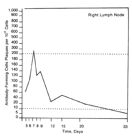 Fig. 3. A graph depicting the antibody-forming cells that appear in the draining node after an intracorneal injection of antigen.