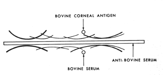 Other serum proteins (alpha-globulin, beta-globulin) are found in the corneal stroma, and nonserum proteins are found in the corneal epithelium.32 In serologic studies some investigators have shown organ specificity for some corneal antigens and species specificity for others (Fig. 4).33