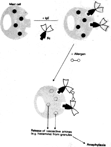 Antigen reacts with the Fab fragment of a specific class of antibody (IgE or reaginic antibody) that is bound to the subepithelial mast cells through a specialized region of the Fc fragment. This leads to degranulation of the mast cells and the release of vasoactive amines (histamine, heparin, platelet activating factor, leukotrienes, kinins, and prostaglandins34 in the tissue (Fig. 5). This, in turn, causes dilatation of the small venules and increased permeability of the capillaries. The result is edema and hyperemia such as is seen in hay fever conjunctivitis, a condition that does not last long and can be treated successfully with vasoconstrictors, cyclic adenosine monophosphate enhancers, or by antihistamines, which compete for histamine (H) receptor sites.35 H1 and H2 receptor sites are probably present in the external ocular tissue.