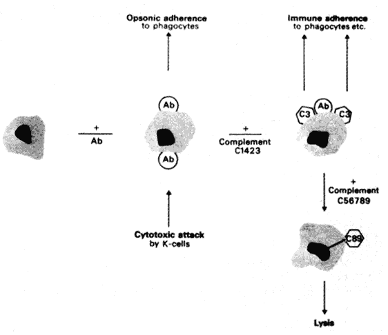 The binding of antibodies to an antigen on the cell surfaces causes a phagocytosis of the cell by (1) opsonic or immune (C3b) adherence, (2) cytotoxicity by killer cells, or (3) lysis through the operation of complement (Fig. 6).