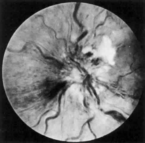 Fig. 7. A patient with systemic lupus erythematosus showing an occlusive vasculitis in the retina.