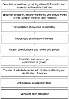 can also be sent for microbiologic analysis. Clinical samples are labeled with the patient's name, type of tissue or fluid, and the date of collection. Universal precautions are followed during collection and processing. Specimens that are shipped elsewhere are put inside double mailing containers with a biohazard label and sent according to current postal regulations. Submitting specimens and a requisition form to the microbiology laboratory starts a sequence of procedures designed to identify infecting microorganisms (Fig. 1). In the laboratory, smears are stained and examined, other rapid diagnostic tests are performed if possible, and inoculated culture media or cell lines are incubated under specific temperature and environmental conditions to enhance growth.