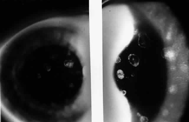 CONJUNCTIVA AND CORNEA There is increasing clinical and laboratory evidence suggesting that EBV is capable of infectingsusceptible cells in the ocular surface epithelia. Expression of CD21, the putative EBV receptor, has been detected in conjunctival and corneal epithelial cells.65 EBV genomic sequences have been detected in 10% of normal corneal epithelial specimens.30 Using highly sensitive reverse transcriptase PCR, EBNA-1 mRNA sequences, but not active latent or lytic cycle associated gene sequences, were detected in 95% of human conjunctival epithelial specimens obtained by impression cytology.31 Taken together, these results suggest that the ocular surface epithelia are sites of EBV persistence following primary infection. Numerous cases of conjunctivitis occuring in patients with IM syndrome were reported prior to the availability of specific tests to confirm a clinical diagnosis of IM.66 More recently, conjunctival involvement has been reported in patients with serologically confirmed IM. In 1981, Meisler and associates reported a case of a unilateral conjunctival inflammatory mass and enlarged preauricular lymph node in an 11-year-old boy with acute IM.67 The conjunctival lesion was biopsied, and an intense lymphocytic infiltrate with occasional multinucleated giant cells was observed in histologic sections. Wilhelmus reported a case of unilateral keratoconjunctivitis in a 16-year-old girl with acute IM.68 This patient had a follicular conjunctivitis and preauricular lymph node. Virus was cultured from the tears and conjunctiva of this patient. Matoba and associates also noted conjunctival inflammation consisting of mild hyperemia occasionally accompanied by a follicular tarsal conjunctival response in a series of patients with IM.69 Gardner and co-workers recently reported a case of a bulbar conjunctival nodule associated with unilateral enlarged preauricular and submandibular lymph nodes in a 38-year-old patient with acute IM. Mature lymphocytes and plasma cells were noted in histologic section, and scattered cells in the lesion stained positively for EBV active latent cycle antigens (LMP-1 and EBNA-2).70 The first reported association between IM and keratitis came from Payrau and Hoel in 1958.71 The authors described a patient with IM, follicular conjunctivitis, and in a single quadrant of one cornea, interstitial infiltrative keratitis. However, theputative association between IM and corneal stromal inflammation in their case is in doubt, because they also found a corneal foreign body within the area of keratitis. In 1980, Pinnolis and colleagues described a 16-year-old boy with classical heterophil antibody-positive (IM) who, upon discontinuation of oral corticosteroids, developed bilateral “nummular interstitial keratitis” without stromal vascularization.72 The corneal opacities were bilateral and symmetric unlike herpes simplex (HSV) and varicella-zoster virus-induced disease, and deeper within the corneal stroma than the subepithelial infiltrates of adenovirus keratitis. Acute and convalescent serologies by indirect immunofluorescence for specific antibody against EBV capsid antigen showed a greater than fourfold rise consistent with acute infection, while antibody titers by complement fixation for HSV, adenovirus, mumps, cytomegalovirus, influenza virus, and respiratory syncytial virus remained low or undetectable throughout the illness. In 1986, Matoba and associates reported 7 patients with purported EBV stromal keratitis, but only 3 of the patients had clinical symptoms of IM or evidence of recent seroconversion.69 In one of the patients, heterophil antibody-positive IM preceded by 1 week the onset of chronic multifocal keratitis. When the authors first examined the patient in referral 9 months later, they found multiple, discrete, anterior stromal opacities in the patient's left eye. In another patient, bilateral, patchy, deep peripheral infiltrative keratitis and a fourfold decrease in antibody against EBV viral capsid antigen were documented at the time of referral 5 months after an “infectious mononucleosis-like illness” associated with bilateral red eyes and photophobia. In another patient, the authors state that IM preceded subepithelial infiltrative keratitis in the left eye by 1 month. When examined 8 months after onset of the keratitis, the patient's left cornea showed features of multifocal anterior stromal and deep peripheral stromal keratitis. Although the other 4 patients in this series did not show evidence of recent EBV seroconversion, their keratitis appeared similar to that of the patients with documented IM. On clinical grounds alone, Matoba and associates postulated that the development of EBV keratitis did not depend on recent EBV infection, but could occur in the chronic carrier state. To summarize the authors' findings in the combined group of 7 patients, the interstitial keratitis appeared in 4 patients as unilateral, multifocal, discrete, sharply demarcated, anterior stromal opacities, 0.1 to 2 mm in diameter, with either a blotchy pleomorphic (Fig. 2) or granular ringlike appearance (Fig. 3), in two patients as bilateral, multifocal, full-thickness or deep stromal peripheral infiltrates reminescent of luetic keratitis (Fig. 4), and in 1 patient with features of both. No patient tested had showed serologic evidence of acute systemic HSV or adenovirus infection. Both patients with keratitis restricted to the peripheral cornea had bilateral disease but lacked serologic evidence for syphilis (nonreactive MHA-TP). Five patients had mild or moderate corneal stromal vascularization. Two patients showed corneal epithelial granularity overlying the stromal opacities.