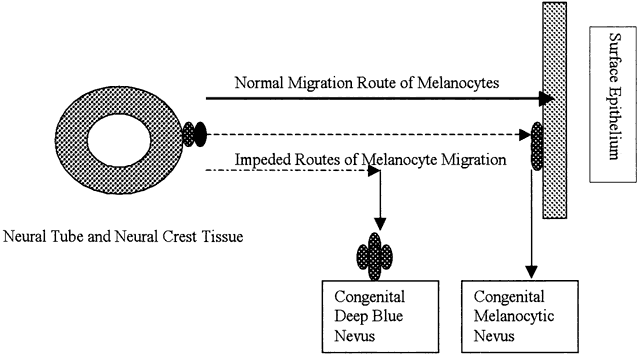 The migration and the differentiation of cells are two of the critical processes in the development of the eye. Abnormalities of migration and differentiation can lead to specific clinical entities. Failure of cells to differentiate at critical times during development (e.g., such as at uterine implantation) may cause loss of the developing embryo (spontaneous abortion). Failure of differentiation of cells of the primary eye fields in the neuroectoderm may result in primary anoplithalmia. Differentiation of neural crest-derived cells proceeds normally in anophthalmia, thus orbital structures such as the rectus muscles and orbital bones are represented. Dendritic melanocytes normally originate in the neural crest and migrate to their final functional site in the basal layer of the surface ectoderm. If migration is impeded in the deep orbital tissues, abnormal melanocytes form a congenital “blue nevus.” If migrating melanocytes fall just short of the surface epithelium, usually in the skin adnexal units, a junctional nevus is formed (Fig. 1). Similarly, a limbal dermoid results from abnormal proliferation and differentiation of neural crest-derived cells in an abnormal location. Although the cells and their cell products are normal, the tissue has no functional role in the area. Peters' syndrome is a condition resulting from faulty separation of the lens vesicle (an ectodermally derived tissue) from the posterior cornea (a neural crest-derived tissue). Clinically, the hallmark is central, posterior corneal opacity; histologically, it is a defect of variable extent in Descemet's membrane and posterior corneal stroma (see Table 1). |