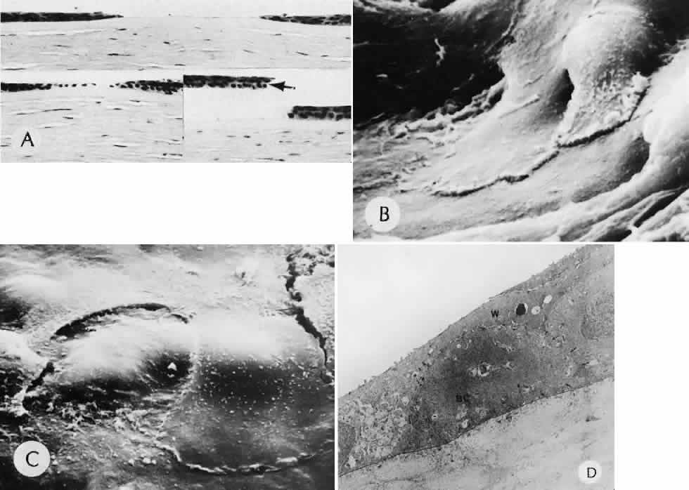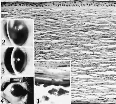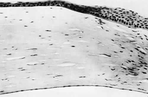that results in reestablishment of functional ocular anatomy.1–3 The goal of therapeutic intervention in the setting of ocular trauma is to promote the repair process and to allow it to proceed as rapidly as possible and heal as completely as possible without compromising ocular function.4 CELLULAR AND EXTRACELLULAR COMPONENTS The four basic cell types found in wound healing are fibroblasts, vascular endothelial cells, inflammatory cells, and epithelial cells. Specialized cell types that participate in ocular wound healing include corneal endothelial cells, retinal pigment epithelial cells, and Müller cells of the retina. Specific cell populations enter an area of injury under the influence of complex biochemical and biophysical processes involving proteins of the extracellular matrix and the coagulation system. Intracellular proteins, such as tubulin and actin, andmyosin filaments function in cell locomotion. Extracellular matrix proteins, such as fibronectin, laminin, and type IV collagen, orient and regulate cell migration and adhesion.5 Coagulation proteins, such as von Willebrand's factor and plasminogen, alsofunction in regulating the cellular events of healing. Vascular endothelial cells are stimulated to leave their resting state and digest basement membrane, proliferate, migrate, and eventually differentiate under the direction of multiple angiogenic growth factors.6 A wound usually is filled first by a fibrin coagulum. Neutrophils, lymphocytes, and histiocytes (macrophages) enter the wound through fibrin scaffolding to clear necrotic debris and confine toxic or foreign substances. Granulation tissue often is the first type of reparative tissue in wound healing (Fig. 1). Although its composition varies somewhat, small-caliber vascular channels in a delicate collagenous stroma infiltrated by acute and chronic inflammatory cells generally characterize it. This amorphous tissue serves as a template for more definitive repair. Metaplasia is the transformation of a cell from one adult cell phenotype to a second cell phenotype. In advanced wound healing, fibroblasts acquire intracytoplasmic characteristics of smooth muscle cells (myofibroblasts).7 The myofibroblasts are able to contract and bring wound edges together. Vascular endothelial cells proliferate and migrate into the wound from preexisting adjacent vessels. The new “vessel” migrates initially as a solid bulb of endothelial cells. This solid cord of cells will canalize and differentiate into mature arterioles, venules, and capillaries. Fibroblasts grow into the wound in a radial manner but will eventually reorient and secrete collagen along lines of established tissue tension. Epithelial cells are found covering surfaces of tissue. Two distinct types of epithelial cells cover the ocular surface: corneal epithelial cells and conjunctival epithelial cells. Cell replacement is accomplished by stem cells located at the limbus for the corneal epithelium8,9 and at the mucocutaneous junction and possibly throughout the conjunctiva for the conjunctival epithelium.10 Migration and proliferation of surrounding healthy epithelial cells heal surface discontinuity. Apoptosis is a biochemical process leading to programmed cell death. Cell death in apoptosis results from intracellular messages. In necrosis, cell death results from toxic external factors (e.g., hyperosmolality). Apoptosis allows for elimination of entire populations of cells without tissue damage or an inflammatory response.11 Elimination of certain cells is advantageous in embryology (e.g., when scaffolding structures are no longer necessary as with the primary vitreous). In certain neoplastic conditions, however, defects in apoptosis may lead to disadvantageous accumulation of cells. Apoptosis also seems to be highly influential in all types of inflammation, including wound healing. In wound healing, apoptosis may function to control the type and degree of tissue response.12 In the anterior cornea, keratocytes have been observed to undergo apoptosis in response to wounding of the cornea.13,14 Abnormalities of apoptosis may be responsible for such conditions as keloid formation in the skin15 and keratoconus in the cornea.16 Wound healing of highly specialized tissues of the eye has several unique features. CORNEAL HEALING The healing of the cornea is unique relative to other soft tissues, because it lacks blood vessels and because it is lined anteriorly and posteriorly by layers of epithelial-like cells. Epithelial cells of the corneacan produce essential wound healing factors normally produced by platelets.17 Architectural repair is accomplished at the level of the corneal stroma. Abrasions are injuries generally involving only the superficial layer (epithelium) of the cornea (Fig. 2). Abrasions are commonly caused by mechanical injuries or anoxia resulting from contact lens overwear. Some or all of the layers of the surface epithelium are lost, but Bowman's membrane remains intact. After a delay of approximately 1 hour, uninjured epithelial cells at the margin of the wound loosen their intercellular and basal attachments and migrate en masse toward the injured area.18 The shape of the wound margin and the biochemical characteristics of the exposed tissue influence the direction and extent of the migration.19 If the entire corneal epithelium is abraded, migrating epithelial cells derived from the limbal stem cells are able to cover the defect completely within 48 to 72 hours. The epithelium will be much thinner than normal until mitotic division reestablishes normal thickness. Re-formation of epithelial basement membrane may not be detectable for as long as 6 weeks after injury.20 Clinically, the healed wound is transparent. Small defects of Bowman's membrane (Fig. 3) do not heal by fibrous proliferation of the stroma. The defect is filled by proliferating epithelial cells (epithelial facet formation) that reestablish the surface continuity of the cornea. The facet 