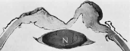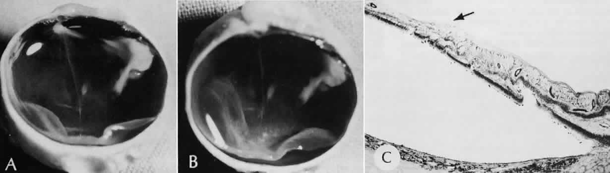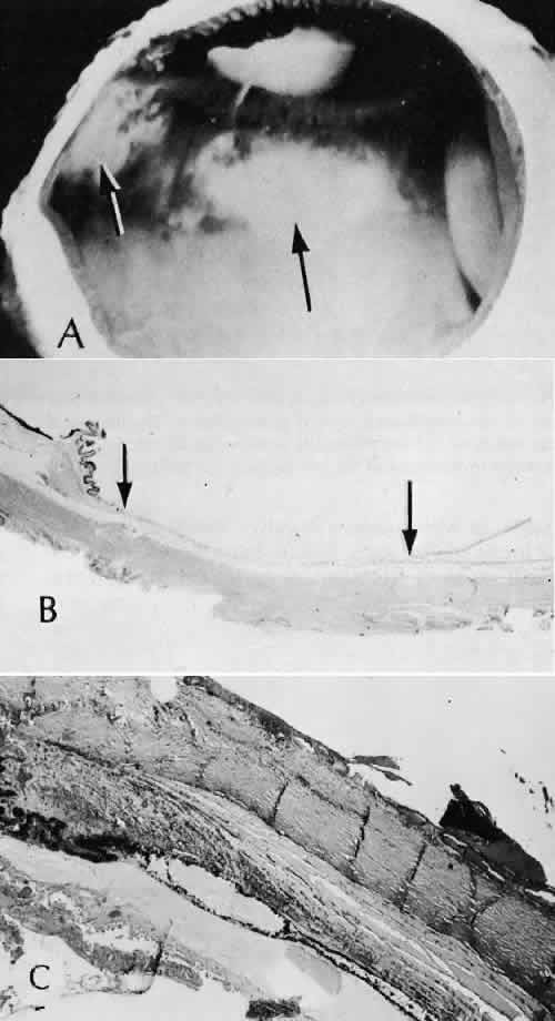 for more effective therapeutic intervention.86 Many complications originate from so-called surgical confusion (Fig. 24). Most arise from a lack of knowledge, a lack of judgment, or problems in perception. At times, lack of attention to detail in preoperative planning may lead to a drug reaction, inadequate anesthesia, misplacement of incisions and sutures, or a patient who is unable to control a cough reflex. What is recognized histologically as the immediate cause of the problem may well have its origin in improper planning of the procedure. CATARACT EXTRACTION Intraoperative Complications Complications occurring from the time the patient enters the operating room until the patient leaves the operating room are considered intraoperative.87,88 Misplacement of an anterior segment incision too far anteriorly into the cornea may create an unacceptable degree of scarring or astigmatism, whereas misplacement too far posteriorly (Fig. 25) may cause the incision to enter the ciliary body instead of the anterior chamber, an especially serious event in glaucoma filtering procedures. Misplacement oflimbal sutures (Fig. 26) may cause anterior wound gaping if placed too far posteriorly or posterior wound gaping if placed too far anteriorly. A deep suture may enter the anterior chamber and lead to wicking and a flat anterior chamber postoperatively. A suture placed at different depths in the two sides of the wound results in faulty apposition of the wound edges. Descemet's membrane is only loosely adherent to the posterior stroma and may be stripped into the anterior chamber at the time of the corneal incision placement (Fig. 27) or injection of sodium hyaluronate. Splitting off of Descemet's membrane from the posterior cornea can lead to postoperative intractable corneal edema.89,90 Intraoperative anterior chamber hemorrhage may result from an inadvertent iridodialysis or from the iridectomy wound. The site of hemorrhage is usually found along the scleral side of the cut edge of the wound. This type of hemorrhage rarely leads to serious clinical problems.91 Rupture of the posterior lens capsule (Fig. 28) increases the risk of vitreous loss and limits options for the implantation of an intraocular lens. Retention of lens capsular tissue or vitreous in the wound (Fig. 29) will significantly delay the wound healing process. Vitreous loss leads to an increased incidence of iris prolapse, bullous keratopathy, epithelial downgrowth, stromal overgrowth, wound infection and endophthalmitis, updrawn or misshapen pupil, vitreous bands, postoperative flat anterior chamber, secondary glaucoma, retinal detachment, cystoid macular edema, optic disc edema, vitreousopacities, vitreous hemorrhage, and other sight-threatening consequences.92 Damage to the endothelium during insertion or positioning of the lens was one of the most common problems with intraocular lens implantation until the widespread use of intraoperative viscoelastics. The endothelial cell damage may manifest on the first postoperative day as corneal edema. The course of the edema may wax and wane and ultimately result in pseudophakic bullous keratopathy months or years after surgery. Detachment of Descemet's membrane, inadvertent iridodialysis, cyclodialysis, or rupture of the posterior capsule also may occur during lens insertion and positioning. Expulsive choroidal hemorrhage (Fig. 30) is a rare catastrophic complication often resulting in total loss of the eye.93 The site of hemorrhage is probably a sclerotic choroidal arteriole where the vessel crosses the suprachoroidal space from the scleral canal. The sudden hypotension after surgical penetration of the globe causes a bending and then a rupture of the arteriole.94 Although most hemorrhages are massive and immediate, they occasionally are delayed, and some may not occur for days or weeks after surgery. Delayed choroidal hemorrhage may occur at the time of corneoscleral suture removal,95 because of clinically unapparent wound dehiscence or as a result of perforation of a corneal ulcer. Histologically, massive choroidal hemorrhagic detachment is associated with a retinal detachment. The retina and choroid may herniate through the scleral wound. A ruptured ciliary artery may be found in the suprachoroidal space. Postoperative Complications Postoperative complications may arise from the time the patient leaves the operating room until approximately 6 weeks after surgery.96 A flat anterior chamber is characterized by anterior displacement of the iris to near or in actual contact with the posterior surface of the cornea. The most common cause is leakage of aqueous along one of the suture tracks. Prolonged decompression of the anterior chamber increases the risk of synechiae formation and intractable secondary closed-angle glaucoma. Corneal endothelial damage may result in bullous keratopathy. Choroidal edema (choroidal hydrops or detachment) (Fig. 31) may be associated with a flat anterior chamber and may potentiate the condition. The choroidal edema will slow or stop aqueous production by the ciliary body, further delaying reformation of the anterior chamber. The histologic characteristics of choroidal edema consist of spreading of the choroidal tissue in a fanlike configuration and eosinophilic fluid filling the intervening spaces. The edema fluid may be lost in processing, leaving multiple apparently empty spaces. Iris or lens capsular incarceration into the wound and extending to the conjunctival space (Figs. 32 and 33) may act as a wick through which aqueous can escape, causing a flat anterior chamber. Histologically, iris, which is frequently recognized only by the presence of melanocytes, is seen in the limbal scar, in the limbal episclera, or in both areas. Vitreous wick syndrome consists of vitreous incarceration in the wound, where the vitreous may extend beyond the wound to the subconjunctival space or occasionally to the ocular surface.97 Anchoring of the vitreous anteriorly in this man