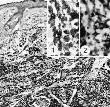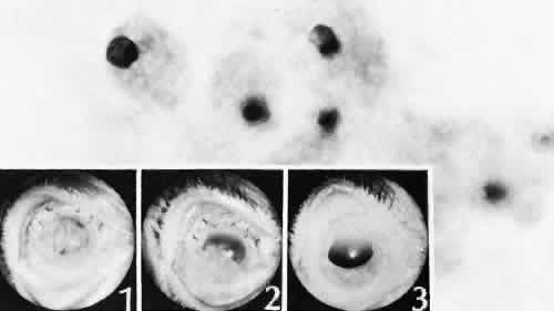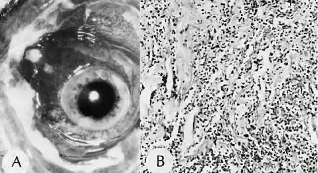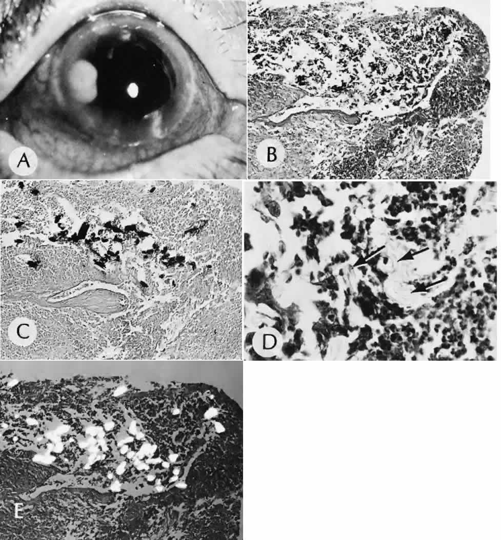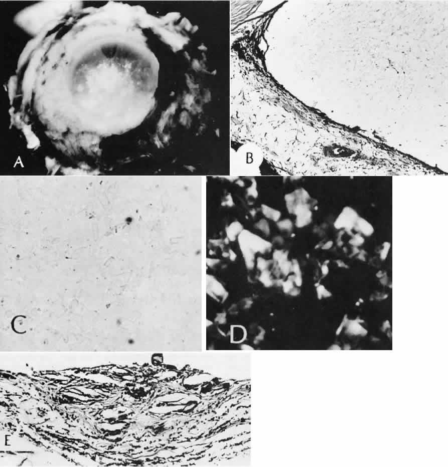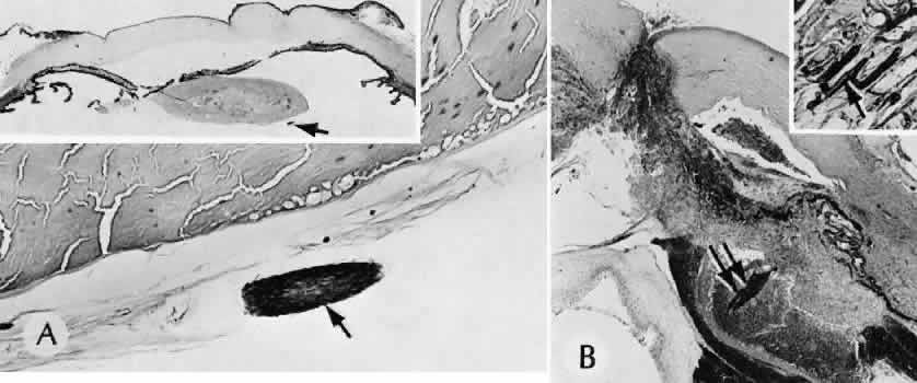 Direct rupture of the globe secondary to blunt trauma may occur at the site of impact. More often the break is at one of the sites of relative weakness of the sclera: the limbus, the insertion of the rectus muscle, the insertion of the superior oblique, or adjacent to the optic nerve. Ruptures at the limbus may extend at right angles to the limbus posteriorly through a rectus muscle insertion site to the posterior portion of the globe. INTRAOCULAR FOREIGN BODIES Intraocular foreign bodies may induce all the con-sequences of blunt injuries and those of penetrat-ing and perforating injuries. The amount of dam-age attributable to the foreign body itself dependson its size, number, location, composition, path through the eye, and the amount of time retained in the tissues of the eye. Even if the missile itself is clean and inert, it may carry fungi, bacteria, vegetable matter, cilia, or bone into the eye. If the missile is small, it may leave only a subtle track through the cornea or other ocular tissue. The only clinical clue to the presence of an intraocular foreign body may be a focal hemorrhagic area of the conjunctiva. Other clinical clues to investigate include intravitreal hemorrhage or alterations of the anterior chamber depth and hypotension. Foreign Body Composition Gold, silver, platinum, aluminum, and glass are almost inert and cause little or no tissue reaction. These materials, however, can cause intraocular damage along their path through the eye. Glass, for example, may lodge in the inferior anterior chamber angle and cause recalcitrant localized corneal edema months to years after the injury. The eye with little or no adverse effects except those caused by the initial injury, although capable of causing a nongranulomatous inflammatory reaction, generally tolerates lead and zinc. Iron can ionize, diffuse throughout the eye, and deposit in all epithelial and neuroepithelial structures, including the corneal epithelium and endothelium, iris dilator muscle and pigment epithelium, ciliary epithelium, neural retina, and retinal pigment epithelium (siderosis bulbi). Iron also may be found in the iris sphincter muscles and the trabecular meshwork. Bivalent iron (ferrous) is more toxic toocular tissue than the trivalent ion (ferric). The toxicity is caused by interference with essential enzyme systems, leading to retinal degeneration and gliosis, anterior subcapsular cataract, and trabecular meshwork scarring with secondary chronic open-angle glaucoma. The iris, lens, and retina can look rusty clinically and macroscopically. The lens frequently is yellow-brown, with clumping of rusty material in the anterior subcapsular area (siderosis lentis) (Fig. 82). The iris can be stained so intensely that heterochromia iridis results with the darker iris in the siderotic eye. Iron may be seen clinically in the anterior chamber angle as irregular, scattered, black blotches that may resemble malignant melanoma. A mistaken clinical diagnosis of malignant melanoma has caused unnecessary enucleation. Histologically, Prussian blue stains the iron blue and shows iron to be present in all ocular epithelial structures and in areas of trabecular meshwork scarring and retinal gliosis. Similar clinical and histologic changes can be seen after intraocular hemorrhage (hemosiderosis bulbi). By electron microscopy, intracellular sideromes are present in the lens epithelium and in corneal keratocytes. Copper can ionize in the eye and deposit in many ocular structures (chalcosis). Metal fragments composed of 85% or more copper tend to cause a violent, noninfectious purulent reaction. Inflammation caused by high copper content foreign material is relatively steroid-resistant and may lead to necrotizing panophthalmitis and loss of the eye. Copper has an affinity for basement membranes, including Descemet's membrane, lens capsule, and internal limiting membrane of the retina. Copper deposi-tion in Bowman's membrane may occur. Clinically,the copper can be seen by gonioscopy in the periph-eral cornea as a yellow-orange deposit at the levelof Descemet's membrane (simulating a Kayser-Fleischer ring as seen in Wilson disease). In the anterior lens, the copper causes a green-gray, almost metallic, disciform opacity, often with serrated edges and lateral radiation, a sunflowerlike cataract (chalcosis lentis). There is no specific histologic stain for copper, but it can be seen easily as a black line in unstained sections. Barium sulfate and zinc disulfide are contained under enormous pressure in the core of golf balls (Fig. 83). If the outer covering of the golf ball is perforated, the contents of the core may be propelled and penetrate deeply into the lids and conjunctiva. Histologically, an amorphous mass without inflammation is present in the tissue. The mass is birefringent to polarized light. The foreign material is white when viewed directly. Because it is opaque to transmitted light, it appears pigmented by light microscopy. Organic material, such as cilia, vegetable matter, and bone, may be carried into the eye and tend to cause a marked granulomatous reaction (Fig. 84). Fungi accompanying the organic material may infect the eye. CHEMICAL, THERMAL, AND ELECTRICAL INJURIES The severity of tissue damage from chemical agents depends on the quantity, concentration, duration of exposure, directness of exposure, presence of preexisting epithelial damage, lipid solubility, anionic affinity, and, most importantly, the pH of the solution. Acid Burns The tear film can act as a buffer against acids unless the amount of acid is excessive or the pH is less than 3.0. Explosions of car batteries caused by spark ignition of oxygen and hydrogen gas mixtures released by sulfuric acid have become one of the most common types of acid injuries. Associated lacerations, blunt injury, and foreign bodies often complicate these injuries.200 Acid causes an instantaneous coagulation necrosis and precipitation of protein, mainly at the epith