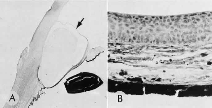 CATARACT EXTRACTION The cataract incision is made into the anterior chamber in such a way as not to injure the trabecular meshwork or unduly injure the cornea. The traditional cataract wound extends from the episcleral tissue posterior to the surgical limbus (defined by the insertion of the conjunctiva and Tenon's capsule) through the corneoscleral tissue to enter the anterior chamber by perforating Descemet's membrane anterior to Schwalbe's line. Clear corneal cataract incision involves only the peripheral cornea. Special circumstances may occur in which a more posterior or anterior route of incision may be desirable.55,56 The most reliable histologic landmark of a healed cataract incision (Fig. 14) is a hiatus of peripheral Descemet's membrane. The cut edges of Desce-met's membrane will curl inward toward the sclera.Endothelial cells may be absent or may have produced a new, thin, periodic acid-Schiff-positive Descemet's membrane over exposed corneal stroma. Occasionally, a fibrous plaque is present at the level of Descemet's membrane. This plaque is another example of fibrous metaplasia, in this instance of the corneal endothelial cells. The corneal stromal portion of the wound may be difficult to identify histologically, except in the early stages of healing. Clues to the position of the intrastromal tract include residual suture material, malorientation of collagen bundles, vascularization along the route of the incision, or incarceration of pigment, lens capsular remnants, or fragments of Descemet's membrane. The superficial portion of the wound tends to heal most completely. Breaks in Bowman's membrane will be present at the site of suture tracts and clear corneal cataract incisions. Also, areas of epithelial cell inclusion may be present in the substantia propria of the conjunctiva at the conjunctival incision. The capsulotomy incision is anterior to the insertion of the zonules through a relatively thick area of the anterior capsule. Most of the lens epithelial cells are removed with the anterior capsule, although some cells may remain in the region of the equator of the lens (Fig. 15). The residual lens capsule is thinnest at its posterior pole. The anterior capsular flap often adheres to the posterior capsule, encasing any residual cortical material and lens epithelial cells. Lens epithelial cells may grow to form large cells, called bladder cells, or may undergo fibrous metaplasia to form a collagenous plaque. Lens cortex outside the lens capsule has an amorphous appearance and is present only in the earliest postoperative specimens. Peripheral iridectomies are peripheral to the iris sphincter in the midportion of the iris rather than at the less accessible iris base. Complete or sector iridectomies include the iris sphincter but do not extend to the iris base. The edges of an iridectomy may show some rounding of contours, but granulation tissue does not form and iris pigment epithelial proliferation does not generally occur. The iris pigment epithelium may be absent for a considerable distance from an iridectomy produced by laser energy. Intraocular lens material (polymethylmethacrylate) often dissolves during tissue processing. Intraocular lenses containing metal components must be removed before embedding because metal will cause extensive artifacts and damage to microtome knives. Often the only clues to the presence of an intraocular lens are subtle compression changes of the iris or ciliary sulcus. Occasionally, residual synthetic material can be identified by polarized light. Anterior chamber lenses may cause a fibrous reaction in the anterior chamber angle (Fig. 16). Occasionally, collagenous tissue will completely encircle a lens (Fig. 17). Iris-supported lenses are associated with the loss of central iris pigment epithelium or residual nylon suture in the posterior chamber. Posterior chamber lenses are the most difficult to identify unless surrounded by lens remnants, in which case a negative image of the optic or loops can be seen. Sulcus-fixed lenses will show focal areas of iris pigment epithelial depigmentation or iris stromal erosion. The lens loop may displace the peripheral iris to come in contact with the trabecular meshwork. PENETRATING KERATOPLASTY Penetrating keratoplasty is a confusing term. The reference point of the incision is the globe; therefore, when a full-thickness graft is performed, the incision penetrates the globe but perforates the cornea. The concave-convex specimen usually is 7.0 to 8.5 mm in diameter and translucent because of fixation. Gross orientation of the specimen is important if pertinent changes are to be represented in the histologic section. Occasionally, as in keratoconus, the graft is placed axially and causes the pathologic area of thinning to be in an eccentric position in the graft. The area of the cone can be detected by observing the shadow of the specimen cast by a strong light. Descemet's membrane will not curl as extensively toward the stroma, as seen with in vivo wounds. Occasionally, Descemet's membrane is lost during tissue preparation because the membrane is easily sheared free of the corneal stroma. With repeat penetrating keratoplasty operations, the original corneal incision may or may not be represented in the specimen because of variations of size and position of the second graft procedure. Penetrating keratoplasty wounds in enucleation specimens can be identified by the changes in Descemet's membrane (Fig. 18). Because the donor tissue is often from a younger person, Descemet's membrane of the graft is thinner than the peripheral membrane of the host. Occasionally, redundant Descemet's membrane from the host intentionally will be left behind in this region by the surgeon. Often small areas of retrocorneal fibrous plaque mark the posterior area of the wound, even in cases of clinically uncomplicated wound healing. In time, the stromal portion of the wound may be undetectable histologically although some malorie