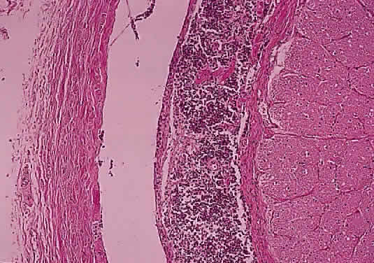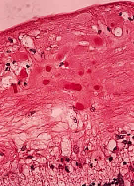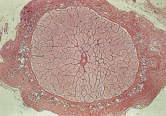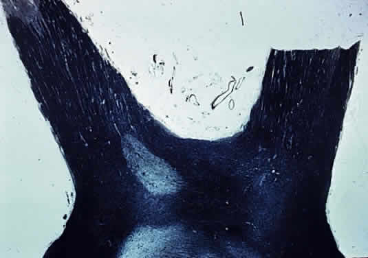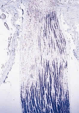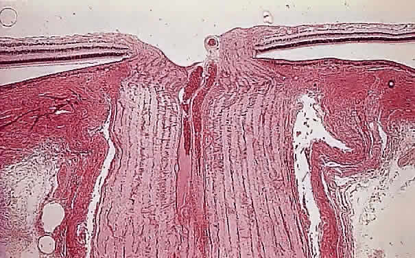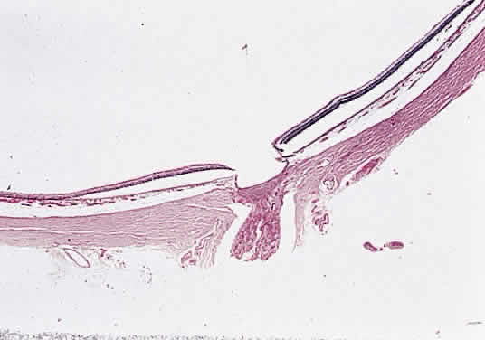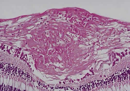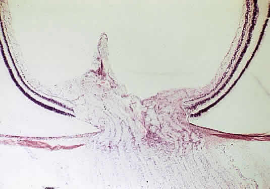 Papillitis is the term used for an inflamed swollen optic nerve head. Regardless of the cause of a swollen disc head, the histopathologic alterations are similar. The earliest change is nerve-fiber swelling in the region of the intermediary tissue of Kuhnt. Bulging fibers initially displace the retina laterally, and the outer layers eventually buckle. The glial lamina is displaced anteriorly, and the vessels are congested. Bundles of nerve fibers are pale staining because of accumulation of watery interstitial fluid. The earliest and most accentuated changes are seen in the outermost fibers around the disc margins (Fig. 20). The swollen nerve head protrudes forward against the vitreous and laterally displaces the central elements of the peripapillary retina from the disc margins. Proteinaceous material often accumulates between the sensory retina and the pigment epithelium around the disc margins, resulting in an enlarged blind spot.