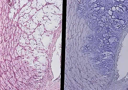 The entity known as “cavernous optic atrophy of Schnabel” is characterized microscopically by large cystic spaces that are posterior to the lamina cribrosa. In these areas, the nerve fibers are destroyed and the cavernous spaces are filled with acid mucopolysaccharide-positive material (Fig. 33). Neither gliosis nor mesenchymal reaction are evident. This intracystic material was initially thought to be vitreous that penetrated into the parenchyma through the internal limiting membrane of the optic nerve head. The condition, however, is an acute infarction of the nerve secondary to acute glaucoma, vascular disease, or “deficient oxygenation states” (hypotension).