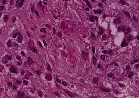 Two histologic features that are present in nearly every example of pilocytic astrocytoma are Rosenthal fibers and eosinophilic granular bodies. Rosenthal fibers are enlarged, brightly eosinophilic cell processes that are sausage or corkscrew-shaped. On Masson trichrome staining, they are bright red (Fig. 38). Ultrastructurally, Rosenthal fibers are defined by amorphous aggregates of electron-dense material within the nerve processes. The number of Rosenthal fibers in different tumors and even within an individual tumor varies considerably; rarely, they are absent entirely. Granular bodies, as the name suggests, consist of rounded eosinophilic proteinaceous structures (Fig. 39). Neither Rosenthal fibers nor granular bodies are unique to pilocytic astrocytomas and are commonly seen in other low-grade astrocytic neoplasms (e.g., ganglioglioma). Their presence, however, essentially excludes a high-grade glioma.