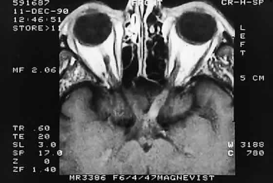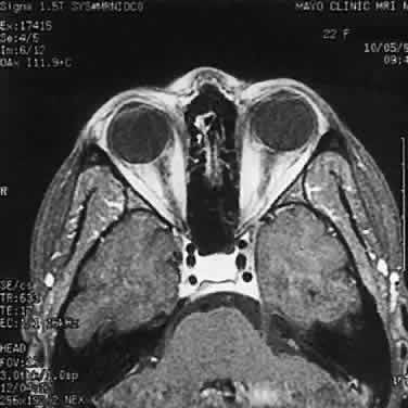 Modern imaging techniques have greatly facilitated the evaluation of optic nerve sheath meningioma and glioma.29 Plain orbital radiographs occasionally show abnormalities of the optic foramen and calcification. Imaging studies (CT and MRI) show diffuse tubular or less commonly, globular enlargement of the nerve sheath complex (Fig. 43).49,50 As with its intracranial counterpart, the optic nerve meningioma typically enhances brightly. “Tram-tracking” results when the thickened sheath outlines the uninvolved central nerve from which it is sharply demarcated. Although characteristic of optic nerve meningioma, this is not specific and can be seen in inflammatory conditions and rarely even in optic nerve glioma. Precise localization of the extent of the tumor is determined with MRI studies, particularly with fat-saturation techniques. Dilation of the anterior perioptic space (perioptic cyst) between the anterior edge of the tumor and the globe is seen in instances in which the tumor does not encroach on the globe and is a distinct and common feature.51,52