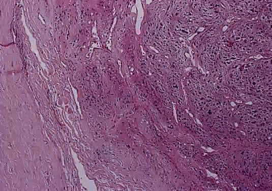 Symptoms are typically rapid in onset and always include subjective vision loss. If accompanied by an acute onset of pain, a diagnosis of temporal arteritis or optic neuritis may be considered, particularly if there is a response to steroids. Absence of light perception and visual-field defects are present in 80% to 90% of patients. Because most tumors do not involve the intraorbital segment of the optic nerve, proptosis is present in only a minority of cases. The early radiographic features may be nonspecific, with only slight enlargement and enhancement of the nerve.42 The chiasm is typically expanded. Diffuse optic nerve gliomas produce enlargement of the nerve, which is typically described as reddish and smooth. Higher-grade neoplasms may have a soft and friable consistency. Histologically, there is diffuse expansion of the nerve by atypical cells (Fig. 41). Mitotic figures and foci of necrosis may be evident. The absence of Rosenthal fibers and granular bodies helps to exclude pilocytic astrocytoma and demyelination. Malignant gliomas of the optic nerve usually arise from the astrocyte. A single report of an optic nerve oligodendroglioma has been published.43