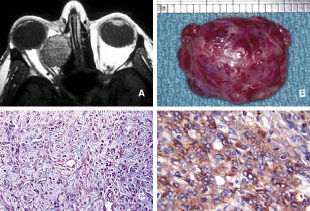 are used interchangeably. The histopathologic typing of a tumor is very important to predict its behavior, and staging and for the management of the patient. In the majority of patients, neoplasms are typed and graded according to their histopathology; light microscopy, electron microscopy, immunohistochemistry, flow cytometry, and genetic analyses are adjunct tests to be used in selected cases. Among these adjunct techniques, the most rapidly expanding field is immunohistochemistry. Immunochemistry is the method of establishing the presence of certain protein and carbohydrate epitopes in frozen or formalin-fixed, paraffin-embedded tissue sections. Documenting the presence of cell, tissue or tumor type specific or cell cycle-related markers can be very useful for differential diagnosis and to determine the biologic behavior of a given tumor. The most useful markers represent structural and secretory proteins, cell membrane and cytoplasm antigens and cell cycle regulators. Table 3 summarizes the most commonly used immunochemical markers in the work-up of orbital tumors. It should be understood, however, that very few markers are totally specific for one cell or tumor type. No cell cycle marker is capable of separating a benign lesion from a malignant one with absolute accuracy. However, diagnostic immunohistochemistry, when it is used as an adjunct technique to histopathological and clinical data, can be extremely useful to narrow down the differential diagnostic possibilities. For example, if a metastatic malignancy is biopsied from the orbit and reveals a poorly differentiated histopathology but positive staining with BCA-225 and estrogen receptors, the clinician can feel quite comfortable that the metastasis has originated from an occult carcinoma in the breast.155,156 Another expanding area that is truly exciting is the identification of cell cycle regulators in different types of tumors; immunohistochemical confirmation or absence of these nucleoproteins may offer prognostically useful information in certain types of tumors. Because changes in the cell cycle are considered as the most fundamental process relevant to the development of cancer, the application of cell cycle markers is likely to expand in the near future to offer valuable information specific to tumor behavior. Presently the most widely used cell cycle markers are proliferation markers, Ki-67-analogs. Ki-67 antibody is selectively expressed in cells in a phase of the cell cycle other than Go and the percentage of nuclear positivity (Ki-67 score) obtained with this monoclonal antibody correlates with malignancy grade.157 MIB-1 is a type of Ki-67 analog antibody that works well in formalin-fixed tissue and many studies have concluded that MIB-1 score provides statistically significant prognostic information.158