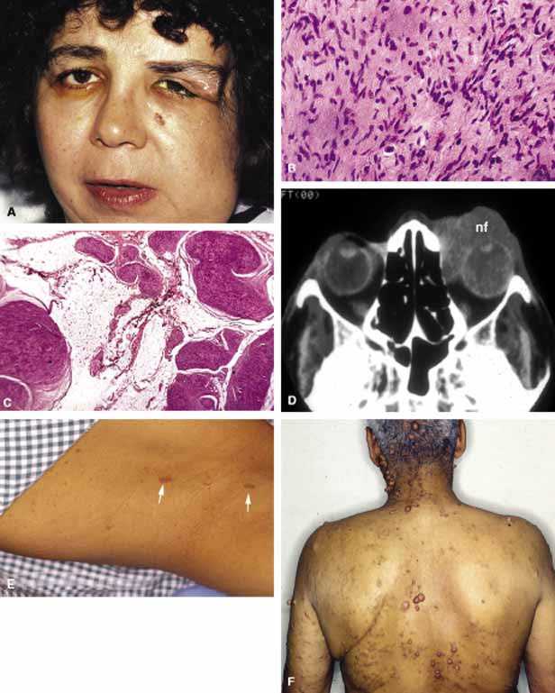 Patients with metastatic orbital tumors most frequently present with rapidly developing unilateral motility disturbance, painful proptosis, and, occasionally, a palpable mass.300,301 Imaging studies with CT and MRI provide information regarding the location of the tumor and the pattern of orbital involvement; however, they rarely offer any clues in terms of the primary site.302,303 Fine-needle aspiration biopsy (FNAB) is an effective method for histopathologic confirmation of orbital metastasis.304,305 In experienced hands, an adequate specimen is often obtained to provide material for routine, as well as special studies and the specimens should be evaluated by an experienced cytopathologist, knowledgeable in orbital diseases.306 False-negative results may be seen in tumors with prominent fibrous stromal reaction or hemorrhage, as well as in neoplasms that are surrounded with marked inflammatory response.307,308 Carcinoid tumors in the orbit may be primary or metastatic; the latter is reported to be a slowly growing circumscribed tumor with a long survival after surgical treatment.309,310 In approximately 10% of metastatic orbital tumors, the site of the primary lesion is unknown. This is a condition that is known as occult primary malignancy, in which the pathologist may play a pivotal role to identify the site of the primary neoplasm. For this purpose histochemical and immunohistochemical studies, polymerase chain reaction, chromosomal analysis, flow cytometry, and electromicroscopy may provide useful information in addition to the routine histopathological evaluation. In children, metastatic neoplasms to the orbit are predominated by small, round, blue-cell tumors, including neuroblastoma, Ewing sarcoma, granulocytic sarcoma, and Wilms tumor.311 Neuroblastoma is the commonest malignant tumor of infants, with an approximate incidence of 1 per 1000 live births, and it is the most common metastatic tumor to the orbit in this age group. Neuroblastoma is most often seen during the first year of life. As a matter of fact, it is the most common congenital neoplasm, which may be widely metastatic at birth, characteristically producing multiple subcutaneous and periocular metastatic lesions with ecchymosis (“blueberry muffin baby”).312 This tumor originates from primitive sympathicoblasts that normally would differentiate into ganglion cells. Microscopically it is made of round or oval, small round lymphocyte-like cells with hyperchromatic nuclei and minimal cytoplasm containing numerous mitotic figures (Fig. 33). Differentiating neuroblasts, ganglion cells, as well as rosette formations (Homer-Wright rosettes) may be seen in primary tumors. Once the tumor metastasizes, however, the features of neural differentiation are lost and it usually presents in the orbit with sheets of small, rounded cells.313 In these cases, ancillary techniques of histochemistry and immunohistochemistry may become valuable. Immunohistochemically, neuron-specific enolase (NSE) and S-100 neurofilament (NF) proteins are useful markers for neuroblastoma. Approximately 75% of the affected children excrete increased amounts of catacholomine byproducts, including vanillylmandelic acid (VNA), norepinephrine, homovanillic acid (HVA), and dopamine in the urine; this is very helpful in diagnosis. SECONDARY TUMORS Tumors extending or infiltrating into the orbit range from congenital malformations, hamartomatous and teratomatous lesions and reactive proliferations to highly malignant neoplasms such as retinoblastoma. The incidence of these lesions varies according to the definition of “tumors,” but they constitute approximately 10% of all orbital space-occupying lesions.314 Secondary orbital tumors may originate from the cranial bones and central nervous system tissues (meningioma, pituitary adenoma, craniopharyngioma),108,200,315,316 periorbital bones (osteoma and osteogenic sarcoma, giant cell-rich reactive lesions),276,277 paranasal sinuses and nasal cavity (squamous cell carcinoma),317 naso-lacrimal drainage apparatus (squamous cell carcinoma),318,319 globe, (uveal melanoma, retinoblastoma),320,321 (Fig. 34) and conjunctiva and the eyelids (squamous cell carcinoma, basal cell carcinoma, melanoma, and sebaceous gland carcinoma)314,320 (Fig. 35). As one can imagine, not only the histopathological features but also the clinical and radiologic manifestations vary, depending on the site of origin in the aforementioned secondary orbital tumors. | |||||||||||||||||||||||||||||||||||||||||||||||||||||||||||||||||||||||||||||||||||||||||||||||||||||||||||||||||||||||||||||||||||||||||||||||||||||||||||||||||||||||||||||||||||||||||||||||||||||||||||||||||||||||||||||||||||||