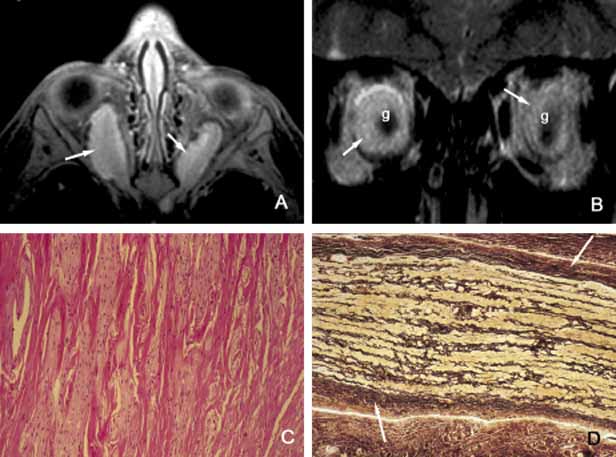 AMYLOIDOSIS Clinical features of orbital amyloidosis include proptosis and ocular motility disturbance and upper lid ptosis secondary to soft tissue infiltration322 (Fig. 36). The amyloid diseases are a diverse group of disorders, which can present as hereditary or sporadic forms. In these diseases, a hyaline material that is known as amyloid is deposited extracellularly in many tissues including fat, skeletal muscle, neural tissues, kidneys, adrenal glands, and, rarely, in the orbit.323 Orbital disease is manifested in most instances as a part of a systemic disorder such as multiple myeloma, rheumatoid arthritis, tuberculosis, etc.323,324 The most common types of amyloidosis are associated with multiple myeloma and primary amyloidoses. In plasma cell dyscrasias, a so-called protein AL is deposited in the affected tissues. In the primary amyloidosis, however, the deposited protein is known as AA, an amyloid derived from serum protein A and alpha-1 globulin. Both deposits AA and AP are insoluble, abnormal proteins and when they accumulate within the tissues, the normal architecture is distorted and thereby the tissue becomes dysfunctional. Under the light microscope the tissue deposits of amyloid appear as homogeneous, eosinophilic, hyaline material that stains orange/red with Congo-red technique and reveals a characteristic apple green birefringe under a polarizing filter. Amyloid deposits are also identified with crystal violet and thioflavin-T stains as well as with immunohistochemical stains that are specific for the AP and AA proteins.325 Ultrastructural examination reveals characteristic 6 to 10 nanometers branching fibrils arranged in a haphazard fashion without a distinct periodicity.326 In contrast with the systemic disease, focal amyloidosis in the orbit is a very rare disorder and may present as either a mass lesion or a diffuse infiltration involving fibroadipose tissues, lacrimal gland and/or extraocular muscles.327,328 The localized deposition of amyloid within the lacrimal gland presents with the enlargement of the gland, molding to adjacent structures and frequently with punctate calcification that is best depicted with CT.329 With MRI, amyloid deposits reveal low signal on T2-weighted images. With both CT and MRI, amyloid deposits demonstrate virtually no contrast enhancement with gadolinium.327 Extramedullary plasmacytomas occasionally may mimic amyloidosis when they are localized in the lacrimal and salivary glands.330 COLLAGEN TISSUE DISEASES Lupus erythematosus,331,332 dermatomyositis,333–335 rheumatoid arthritis,336,337 scleroderma,338–340 polyarteritis nodosa,342,343 angiolymphoid hyperplasia (Kimura disease),344–347 Behçet disease,348 and Churg-Strauss syndrome.349 are also known to involve orbit occasionally, and form diffuse and/or localized inflammation. ENOPHTHALMOS In great majority of orbital diseases, patients develop proptosis and displacement of the globe. It is important to remember, however, that in certain conditions the clinical presentation may be just the opposite, namely, the patient develops enophthalmos instead of exophthalmos.350,351 Enophthalmos (posterior/inferior dislocation of the globe) may occur with two basic mechanisms: structural abnormality, most commonly secondary to penetrating or nonpenetrating trauma with fractured orbital walls, and fibrosis of the orbital soft tissues, secondary to a number of pathological causes, including chronic inflammation, radiation degeneration, neoplasia, etc. The structural abnormality may also be related to a congenital malformation of the sphenoid bone in neurofibromatosis. If the bony defect is large enough, the globe may develop enophthalmos. Last but not least, orbital fibroadipose tissue may develop scarring and atrophy secondary to a number of diseases including scleroderma, radiation exposure, aging, and lipodystrophy.352 |