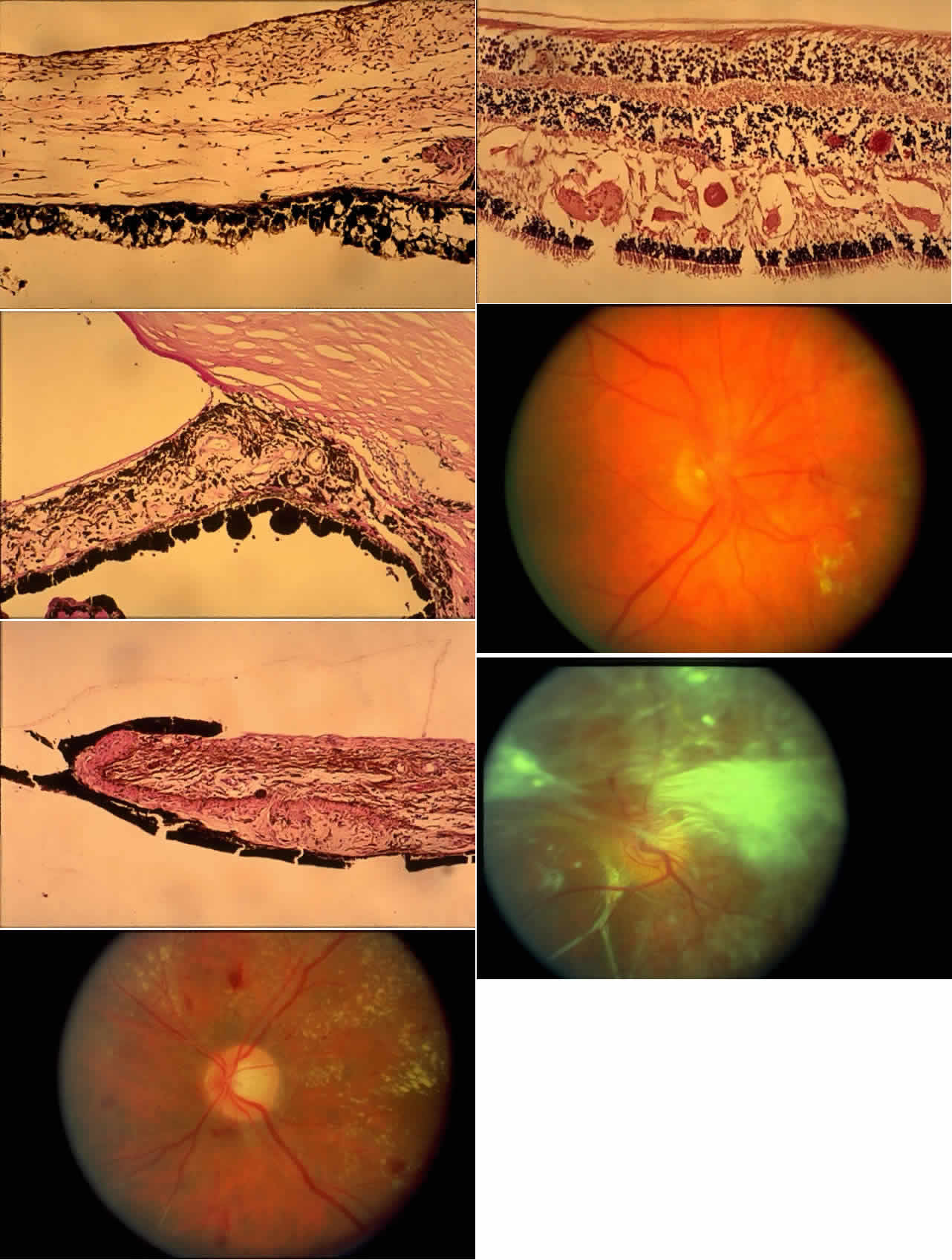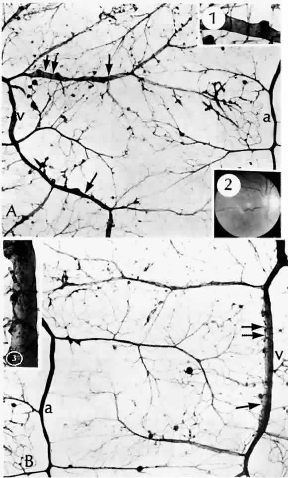 surface. In fact, it is not known what prompts the development of diabetic retinopathy, although ischemia clearly plays a role.25 Certain alterations have been observed in blood from diabetic patients, including increased rigidity and aggregation of the erythrocytes, altered platelet activity, changes in plasma proteins, and increased affinity of hemoglobin for oxygen. Both the increased aggregates of platelets and the abnormally rigid erythrocytes can occlude small blood vessels, contributing to retinal ischemia. The increased affinity of hemoglobin for oxygen means that less oxygen is released to the tissues.26 Whether tightly controlling blood sugar levels improves retinopathy or even halts its progression is controversial. In one investigation,27 dogs were made diabetic and put into three groups: good control for 5 years, poor control for 5 years, and poor control for 2½ years followed by good control for the remaining time. The third group had developed almost as many microaneurysms at 5 years as did the group under poor control for the entire time. This study indicates that tight control is maximally beneficial when undertaken early in the course of the disease. Human studies to corroborate or refute this have been understandably difficult to carry out. Transplantation of the pancreas or pancreatic islet cells is one way to normalize blood glucose by restoring endogenous insulin. In one study, eight patients who received pancreatic transplants exhibited no difference in retinopathy between the four whose transplants functioned and the four whose transplants failed.28 In another small study, the proliferative retinopathy of patients who received pancreatic transplants remained stable or worsened, despite their being euglycemic.29 Recently, results from a large prospective series, the Diabetes Control and Complications Trial, have shown that tight control, including three or more daily insulin injections or continuous infusion, based on at least four glucose determinations daily, does prevent development or progression of retinopathy to a significant degree. All patients in the primary prevention group had diabetes for 5 years or less and did not have retinopathy at the outset of the study. Thus, tight control begun early may indeed help prevent or delay the onset of retinopathy.30 As noted previously, duration of disease is a strong predictor for development of retinopathy.31,32 Prepubertal children may develop minimal retinopathy,33 but the blood-retinal barrier is altered during puberty, apparently through hormonal influence, leading to retinopathy.34 Unless the macula is edematous, nonproliferative retinopathy is asymptomatic and may be found only on routine ophthalmoscopy. In patients who develop diabetes after puberty, retinopathy may be a presenting sign of the disease. The earliest manifestation of diabetic retinopathy is the appearance of microaneurysms (Fig. 5, Color Fig. D). They appear as small red dots clinically and often are seen more readily on fluorescein angiography, where they fill and leak, with staining of the vessel wall.35 Histologically they are small “outpouchings” of the capillary vessel wall and are usually saccular but occasionally fusiform in shape. They can occur anywhere along the capillary network between the arteriole and venule.18 Some microaneurysms, however, do not fill with fluorescein and have been shown to be thin-walled capillary outpouchings filled with erythrocytes. They may represent either one stage of microaneurysm formation or a specific type of it.36 As shown by trypsin digestion, capillary pericytes are lost first,27 followed by endothelial cells (Figs. 6 and 7). Aldose reductase, one of the enzymes in the sorbitol metabolic pathway, is present in significant quantities in retinal capillary pericytes, but not in endothelial cells, and may thus be implicated in the formation of microaneurysms.37 The final result is an acellular segment of capillary that is nonperfused on fluorescein angiography.36 The normal retinal vasculature, including the capillaries, forms a barrier to the free exchange of metabolites.38 This blood-retinal barrier is damaged in diabetes, allowing leakage of larger molecules, which are clinically manifested as hard exudates and retinal edema. Ultrastructurally, the normal junctions between capillary endothelial cells are disrupted.39 Hard exudates clinically appear as shiny yellow deposits (see Fig. 5; Color Fig. D). When they surround a microaneurysm in a circular pattern, the condition is called circinate retinopathy. Histologically, the deposits accumulate at the level of the outer plexiform layer (Fig. 8, Color Fig. E) and consist of lipids, complex carbohydrates, and proteins, as demonstrated histochemically. Hard exudates are normally asymptomatic unless they involve the macula, where they cause a drop in visual acuity. If a leaking microaneurysm can be identified on fluorescein angiography, laser photocoagulation can obliterate it. Over time, the fluid is resorbed, and sometimes visual acuity can improve.40 Cystoid macular edema can be caused by many different diseases as well as diabetes. It is characterized by diffuse leakage of the capillaries in the posterior pole. In advanced cases, the cystoid spaces are ophthalmoscopically visible, resembling the petals of a flower. Cystoid edema is seen more easily on fluorescein angiography, since the spaces fill with fluorescein. Histologically, cystoid fluid is seen at the outer plexiform layer, but may also accumulate in the inner nuclear layer. The synapses of the outer plexiform layer are slanted in the fovea because the inner retinal layers are pushed away from the foveal pit. Because of these slanted connections, this area can be distended by fluid more readily. Ultrastructurally, the fluid appears to be located within Müller cells, and there is evidence of capillary endothelial damage.41 In some patients, the cystoid spaces can coalesce, forming lamellar