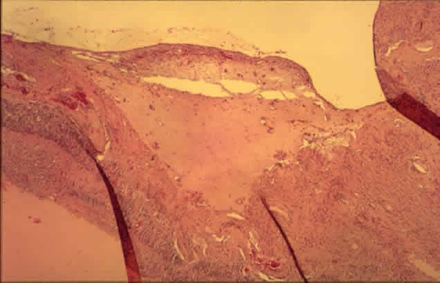 Arteriosclerotic changes in the choroidal vessels are more common in diabetic patients than in matched nondiabetics. These changes include fibrosis and hyalinization of the media with plaque formation in larger vessels.18 The choriocapillaris shows diffuse thickening of the basement membrane, sometimes to the point of total vascular occlusion. Both pericytes and endothelial cells appear to participate in this process of excess basement membrane synthesis. The obliterated capillaries form eosinophilic nodules that superficially resemble drusen, although they are on the choroidal side of Bruch's membrane. They also resemble the nodules seen in kidneys of patients with diabetic glomerulosclerosis.24 Two patients in Hidayat and Fine's series,24 both less than 30 years old and who had not been treated with photocoagulation, showed peripheral subretinal neovascularization, one near the equator and one near the ora. The significance of this finding is uncertain. |