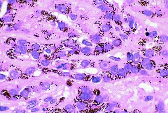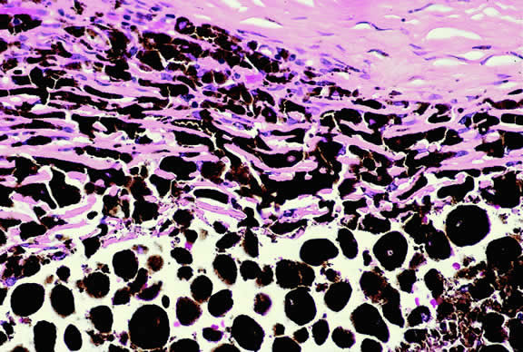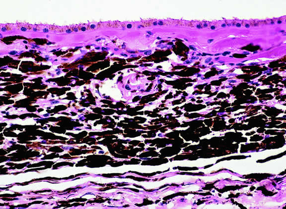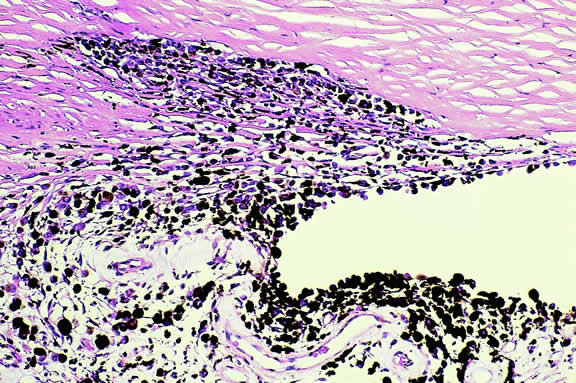 melanin pigment granules or melanosomes in the cytoplasm of the melanocytes.1 The pigment may protect against the development of uveal tumors, because