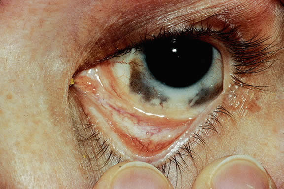UVEAL MELANOMA On a worldwide basis, uveal melanoma is the most common primary intraocular tumor in adults. In the United States and Europe, uveal melanoma is also the most common primary intraocular tumor. In most of the rest of the world, the most common intraocular tumor is the pediatric retinal neoplasm retinoblastoma.28 Uveal melanoma is rare, even among persons of European ancestry. Less than 2000 cases occur yearly in the United States where the incidence is estimated to be 7 cases per million per year, less than 10% the incidence of lung cancer.29 Although pediatric and even rare congenital cases30,31 have been reported, uveal melanoma generally occurs in older persons. The mean age of patients eligible for treatment in the Collaborative Ocular Melanoma Study (COMS) I-125 brachytherapy study was 59 years.32 Less than 0.8% of cases occur in patients younger than age 20 years.33 In general, patients who are older tend to have larger tumors and are more likely to die from disseminated melanoma after enucleation. Recent data from COMS indicates that uveal melanoma affects both sexes equally.32 Predisposing Factors Race is an important predisposing factor. Uveal malignant melanoma has a definite predilection for Europeans who have blue or lightly pigmented eyes.34, 35, 36 In a recent study in Florida, the risk of uveal melanoma in non-Hispanic white men was 72 times that in black men.29 Uveal melanoma also is less common in Latin and Native Americans29,37 and Asians. The incidence of uveal melanoma in the United States is 25 times greater than that in Taiwan, that is, 7 per million versus 0.28 per million.38 The prognosis of melanoma in black and white patients is similar. Tumors in black patients typically show more necrosis and heavy pigmentation.39 Caucasian patients who have congenital ocular or oculodermal melanocytosis (nevus of Ota) are especially at risk to develop uveal malignant melanoma.40 It has been estimated that about one in 400 white patients with oculodermal melanocytosis will develop uveal melanoma in his or her lifetime.41 This risk is about 25 times greater than the risk in unaffected patients. Melanomas have developed in young patients with Ota's nevus.33,42–44 Ocular and oculodermal melanocytosis are relatively common in Asians45 but do not appear to predispose them to melanoma. Several African Americans with nevus of Ota who developed uveal melanoma have been reported.46,47 The substrate for the development of melanoma in white patients with ocular melanocytosis is a diffuse nevus that affects all, or part, of the uveal tract. Clinically, the nevus typically is evident as hyperchromic heterochromia iridum, patchy slate gray epibulbar pigmentation, and a darker aspect of the fundus compared with the fellow eye (Fig. 8). A sector of uvea is affected in some patients, however, and the nevus may spare the iris. The uvea in congenital melanocytosis is thickened by an increased number of heavily pigmented nevus cells similar to those found in melanocytomas (Fig. 9). RPE abnormalities such as drusen often develop on the surface of the thickened choroid.48 The sclera also contains patchy foci of pigmentation. The slate gray conjunctival pigment reflects the presence of dendritic melanocytes on the epibulbar tissues deep to the conjunctiva. Nevus of Ota does not predispose to conjunctiva melanoma. However, patients rarely may develop melanomas of the orbit49–51 and even leptomeninges.1,52,53 White patients who have congenital ocular or oculodermal melanocytosis should be followed periodically because of the increased risk of uveal melanoma.54