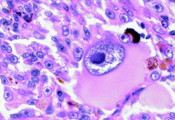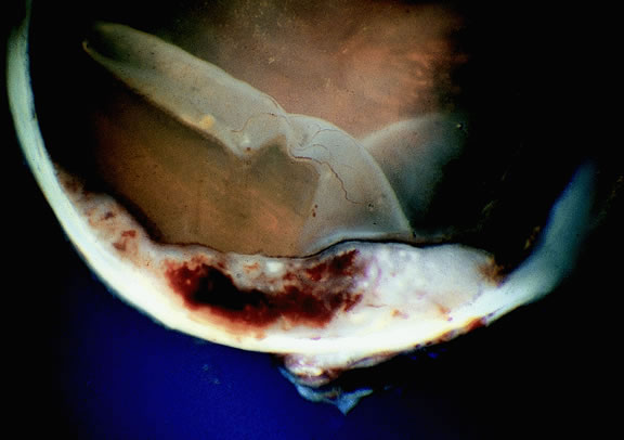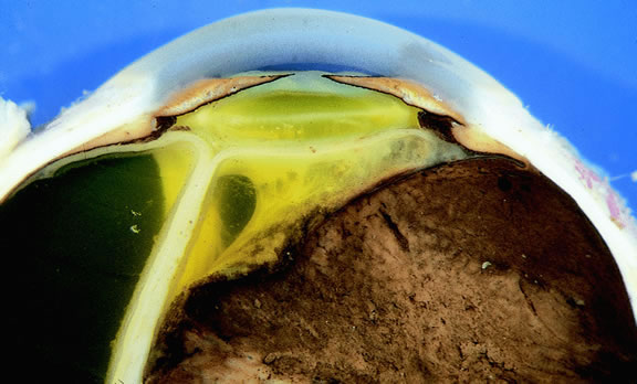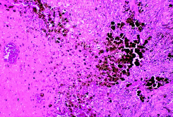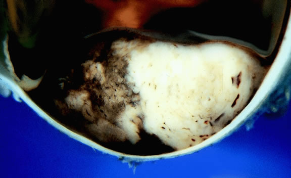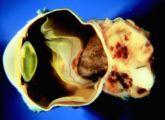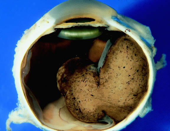 Uveal melanomas vary markedly in their pigment content. Some tumors are totally amelanotic; others are maximally pigmented. In some instances, distinct clones of tumor cells that vary in pigment content are evident on gross examination or even clinically (Fig. 25). A friable or granular appearance of the cut surface of a melanoma noted during gross examination may be indicative of necrosis or a tumor rich in poorly cohesive epithelioid cells. Melanomas that contain cystic cavities occasionally are encountered.85