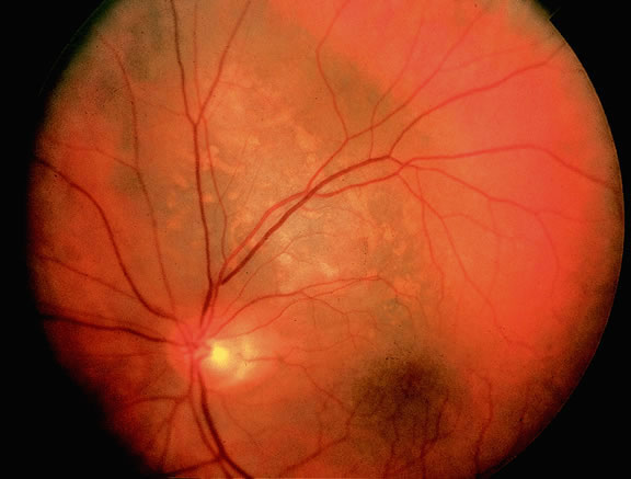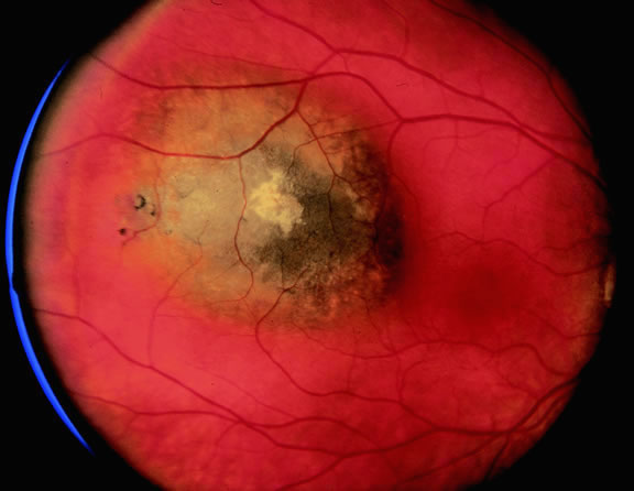About 3% of melanomas have a diffuse growth pattern. These relatively flat tumors grow laterally without thickening the choroid.86,87 Most are about 2 mm in thickness. Diffuse melanomas often are of mixed cell type and, compared with localized lesions, are more apt to infiltrate the sclera and invade the optic nerve or orbit (Fig. 26). Delayed diagnosis or misdiagnosis is common.