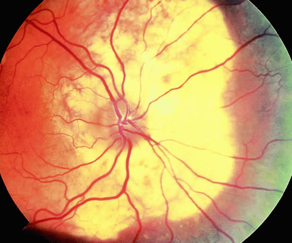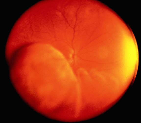Retinal detachment is the most common cause of visual loss in eyes with posterior melanoma. Initially solid, the detachment becomes exudative as serous fluid accumulates. Visual loss initially may be caused by induced hyperopia as a subfoveal tumor displaces the retina anteriorly. The exudative detachment initially is localized; fluid accumulates in the subretinal space tented up by the growing tumor. Failure to find a retinal hole in a patient with retinal detachment should always raise the possibility of a choroidal tumor or some other choroidal process known to produce an exudative detachment. Total retinal detachments are found in some eyes with choroidal melanomas, generally those with larger or neglected tumors (see Fig. 13). Melanoma-bearing eyes with total retinal detachments often have secondary closed-angle glaucoma caused by pupillary block or iris neovascularization.74,75 Clumps of orange pigment may be seen in the subretinal space overlying the tumor (see Fig. 40).