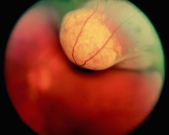 Many choroidal melanomas have a characteristic mushroom or collar button configuration that results when the tumor breaks through Bruch's membrane (Figs. 19, 20, 21, and 22). In such cases there is often secondary choroidal, subretinal, or vitreous hemorrhage. Dilated, intrinsic vessels often are evident in the mushrooming dome of nonpigmented melanomas. The vessels are obscured in more pigmented tumors.48