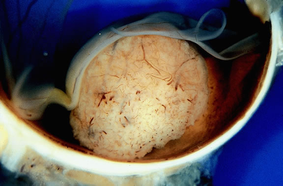 Today, relatively few eyes with metastatic carcinoma are accessioned by ophthalmic pathology laboratories because diagnosis is made clinically and most eyes are treated with radiotherapy and/or chemotherapy. Relief of pain is a major indication for enucleation of eyes with advanced disease. Macroscopically, the appearance of eyes with uveal metastases is somewhat variable. In most instances the uveal tract is diffusely thickened by an infiltrate of white, pink, or yellow tissue (Fig. 50). Metastases occasionally have a multinodular growth pattern, and a few larger lesions are oval in configuration (Fig. 51). Bruch's membrane almost always remains intact, however. Although there are exceedingly rare exceptions to the rule, one generally can conclude that a mushroom-shaped tumor of the choroid is a malignant melanoma.