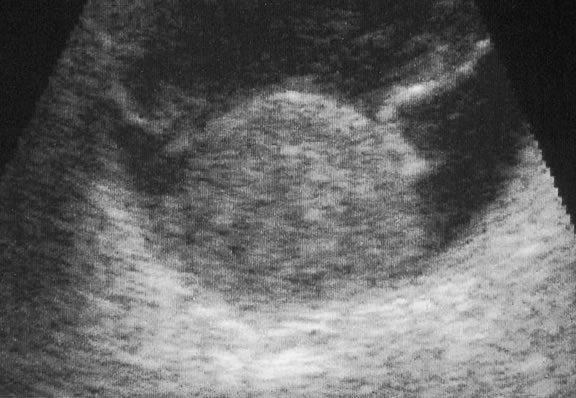 Although the diagnosis of melanoma often can be made by careful indirect ophthalmoscopy, ancillary studies such as intravenous fluorescein angiography, indocyanine green angiography, ultrasonography, computed tomography, magnetic resonance imaging, the radioactive phosphorus uptake test, and fine-needle aspiration biopsy (FNAB) occasionally are required to support or confirm the diagnosis.48,54 The characteristic fluorangiographic features of uveal melanoma include mottled hyperfluorescence in the vascular filling phases and diffuse late staining of the mass and surrounding subretinal fluid. A characteristic double circulation in which both the retinal vessels and the choroidal vessels in the tumor are readily evident may be shown by larger amelanotic tumors, particularly those that have perforated Bruch's membrane. The prominent blood vessels seen in amelanotic mushroom-shaped melanomas may impart a pseudoangiomatous appearance to the lesion.48 Ultrasonography can support the diagnosis of ciliary body or choroidal melanoma and is a particularly helpful way of disclosing tumors in eyes with opaque media.54 Ultrasonographic studies can alsodemonstrate areas of extrascleral extension. A scan ultrasonography shows a high internal spike and low internal reflectivity. B scan ultrasonography shows characteristic acoustic hollowness and choroidal excavation (Fig. 23). Hemangiomas and metastases usually appear acoustically solid because they contain multiple acoustic interfaces. Transvitreal FNAB occasionally is performed if the diagnosis remains uncertain after routine tests and the choice of therapy requires an accurate diagnosis.82,83 Potential candidates for FNAB include the patient who has a history of breast cancer and presents with a solitary amelanotic choroidal tumor that could be a primary amelanotic melanoma or the patient who is thought to have a choroidal metastasis but has no history of cancer.83 Gross Pathology Choroidal melanomas initially arise in the stroma of the choroid. In early cases, the profile of the sectioned tumor is oval or almond-shaped, and its tissue usually appears relatively cohesive after fixation (Fig. 24). Although some tumors diffusely infiltrate the uvea, most uveal melanomas are relatively well-circumscribed tumors with distinct margins. In many cases the growing melanoma perforates Bruch's membrane and enters the subretinal space where its apex typically assumes a spherical shape that often is likened to a mushroom or collar button (see Figs. 19 to 22.). Dilated vessels often are found in the mushrooming head of the tumor because the ends of Bruch's membrane exert a compressive cinch-like effect on the waist of the tumor (see Fig. 22). Rupture of Bruch's membrane was present in 87.7% of 1527 large- or medium-sized melanomas examined in the COMS.84 Retinal invasion was present in nearly half (49.1%), and tumor cells were found in the vitreous body in one fourth.