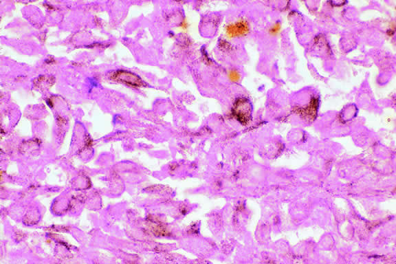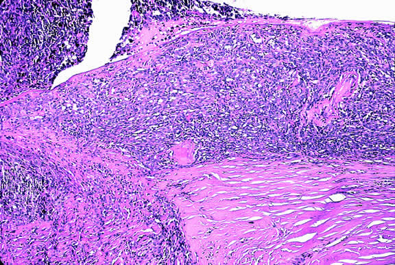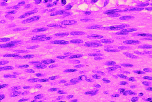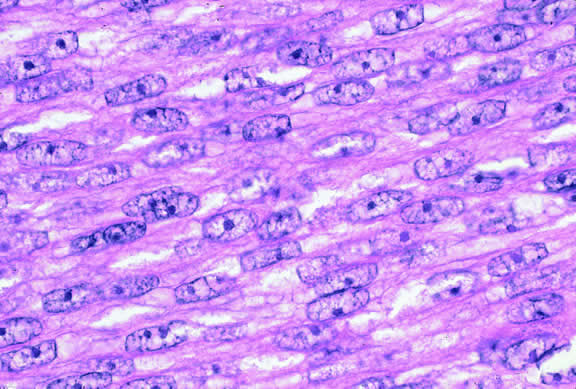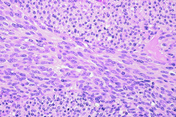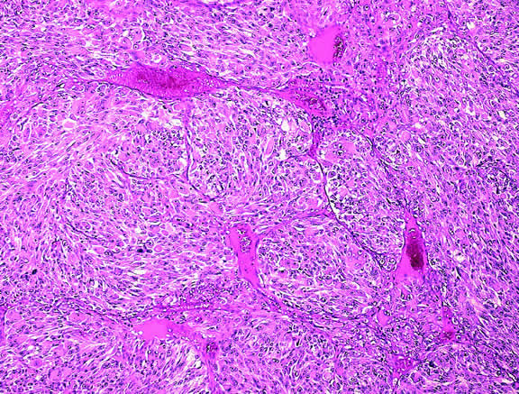 During gross examination, the external surface of an eye harboring a melanoma should be inspected carefully for signs of extraocular extension. The latter may be evident as an epibulbar nodule or a vortex vein that is dilated and heavily pigmented. Tumor infiltration of scleral emissarial canals may be evident on the cut surface of the globe at the base of the tumor. Treatment effects are evident in eyes whose tumors have been treated previously with radioactive plaque brachytherapy or transpupillary thermotherapy (TTT).88,89 Prior plaque therapy often causes prominent areas of diffuse chorioretinal depigmentation and atrophy. TTT scars usually are white and sharply demarcated like a coloboma and often are rimmed by heavily pigmented foci of RPE hyperplasia. Histopathology The cells comprising uveal melanoma constitute a biologic spectrum comprising bland spindle A melanoma cells at one end and wildly anaplastic epithelioid cells at the other. The term spindle cell is derived from the fusiform or spindled configuration of the cells' cytoplasmic outline. They are bipolar in shape, and many have long tapering processes that occasionally are highlighted when individual pigmented cells are seen in a largely amelanotic tumor. Spindle cells grow in a syncytial fashion forming interweaving fascicles of parallel oriented cells (Fig. 30). The cells can be pigmented or nonpigmented. Two types of spindle cells are recognized; spindle A and spindle B. These are distinguished by their nuclear characteristics. Spindle A nuclei are tapering ovals or cigar-shaped and have finely dispersed chromatin (Fig. 31). If a nucleolus is present, it usually is inconspicuous. Many spindle A cells have a longitudinally oriented chromatin stripe that actually is caused by a fold in the nuclear membrane. The nuclei of spindle B cells have distinct nucleoli and coarser chromatin and tend to be plumper and more oval in shape (Fig. 32). Epithelioid melanoma cells comprise the poorly differentiated end of the cytologic spectrum. Melanomas that contain epithelioid cells have a poorer prognosis. The term epithelioid meaning epithelial-like reflects the fanciful resemblance of the tumor cells to the cells of simple epithelia. Epithelioid cells have abundant cytoplasm and are often polygonal in shape (Fig. 33). They have distinct cytoplasmic margins, are poorly cohesive, and do not grow as a syncytium. The nuclei of epithelioid cells are usually round or oval and often appear vesicular because of margination or clumping of the chromatin along the inner side of the nuclear membrane. Epithelioid melanoma cells also have prominent nucleoli that are often large and reddish purple. Variants of epithelioid cells include relatively uniform small epithelioid cells (Fig. 34) and bizarre tumor giant cells that may appear wildly anaplastic (Fig. 35). Melanoma cells should be classified by their nuclear characteristics. Spindle-shaped cells that have epithelioid nuclei occasionally are encountered; such cells are classified as epithelioid. In recent years, the term intermediate cell has been used increasingly. Intermediate cells are cells that have nuclear characteristics that are intermediate between spindle B and epithelioid. For example, one might apply the term intermediate cell to a spindle B cell that has a nucleus that is somewhat large and has a fairly prominent nucleolus. Occasionally, the spindle cells in a melanoma are arranged in a radial fashion around vessel or fibrovascular septa (vasocentric pattern), or the nuclei form rows that resemble the Verocay bodies or Antoni A pattern seen in schwannoma (Verocay pattern). Melanomas are called fascicular if these patterns dominate5 (Fig. 36). Fascicular melanoma was a category in Callender's initial classification90 that was dropped from McLean's 1983 modification.5,91 Varying degrees of necrosis may be found (Figs. 37 and 38). Necrosis tends to be more prominent in rapidly growing high-grade tumors or tumors that have had prior brachytherapy. The necrosis may be patchy and focal or may involve extensive parts or even all of the tumor. Aggregates of melanophages typically are found in the necrotic areas. Total infarction of the tumor (and other intraocular structures) may occur in eyes with severe secondary closed-angle glaucoma. As mentioned previously, melanocytoma is prone to spontaneous necrosis. The latter diagnosis should always be considered when a totally necrotic, heavily pigmented tumor is found.