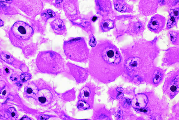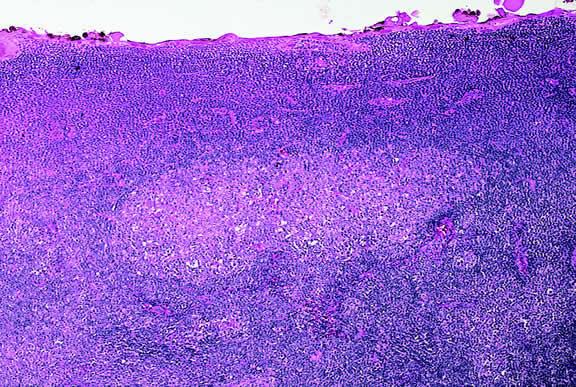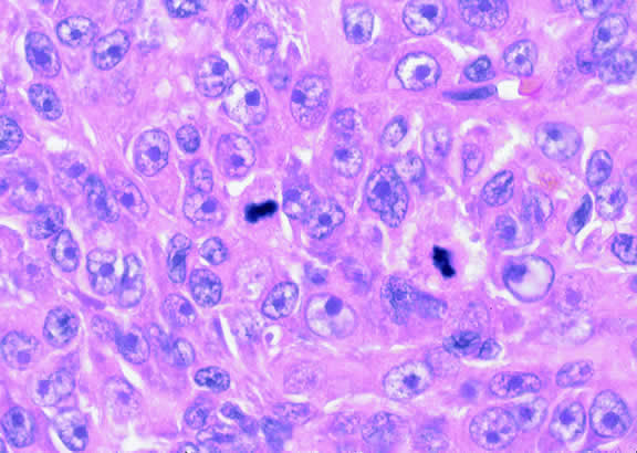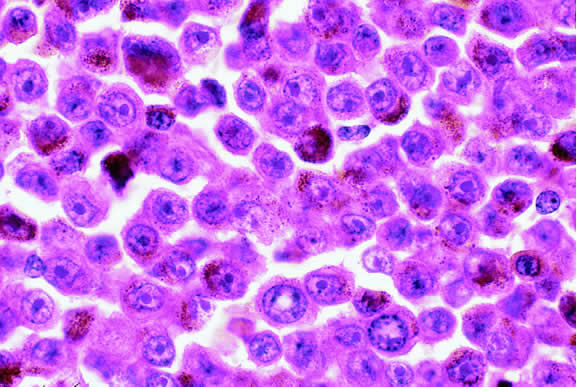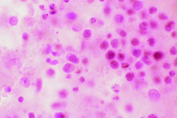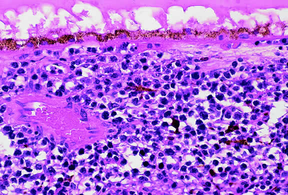 LYMPHOPROLIFERATIVE TUMORS Leukemia Secondary ocular involvement is relatively common in patients with advanced leukemia; Leonardy and coworkers199 found ocular involvement in 31% of 135 eyes obtained postmortem from leukemic patients. Ocular tissues may involved primarily by infiltrates of leukemic cells or secondarily by manifestations of the disease including hemorrhage, ischemia, or secondary infection related to primary immunosuppression or the effect of immunosuppressive drugs.200,201 Although leukemic cells can infiltrate almost any ocular tissue, choroidal infiltration occurs most often. Kinkaid and Green201 found some degree of choroidal infiltration in 65% of 367 pairs of postmortem eyes from leukemic patients examined histopathologically. Significant choroidal involvement often is accompanied by a shallow serous retinal detachment at the posterior pole. Secondary retinal changes include retinal hemorrhages, white centered hemorrhages, cotton-wool spots, nonperfusion, vitreoretinal neovascularization, and central retinal vein occlusion. Vitreous and choroidal hemorrhage also may occur. Infiltration of the optic nerve may produce an optic neuropathy.202–204 Iris infiltration may manifest clinically as iris heterochromia, a pseudohypopyon of leukemic cells, or hyphema. Lymphoma Although non-Hodgkin's lymphoma often affects the orbit and conjunctiva, intraocular involvement by lymphoma is relatively rare and occurs in two basic ways. First, patients who have widely disseminated systemic lymphoma may develop secondary ocular involvement whose typical manifestation is uveal infiltration. Second, in the variant of central nervous system (CNS) lymphoma that has been called primary lymphoma of the CNS and retina, the vitreous characteristically is involved and the uvea is spared. The latter entity also has been called vitreous large cell lymphoma or ocular “reticulum cell sarcoma.”205–208 In addition to the vitreous, the lymphoma cells also infiltrate the retina, and typically collect between Bruch's membrane and the retinal pigment epithelium, forming solid yellowish RPE detachments, which are highly suggestive of the diagnosis. This rare variant of primary CNS lymphoma should be suspected in older patients who have chronic vitritis that is unresponsive to therapy. Cytologic examination of diagnostic vitrectomy specimens reveals a highly cellular and extensively necrotic infiltrate that contains atypical lymphocytes with prominent nucleoli and protrusions of the nuclear membrane (Fig. 53). The significance of elevated vitreous interleukin 10 levels as a diagnostic marker for lymphoma is controversial.209,210 Many patients who undergo diagnostic vitrectomy to exclude lymphoma actually are found to have a form of granulomatous vitreitis termed idiopathic senile vitritis.211 Cytologically, the latter lacks necrosis and contains a mixture of well-differentiated lymphocytes and epithelioid histiocytes with a spindled or dendritiform configuration. Careful cytologic screening and follow-up are warranted in such cases, however, because vitreous lymphoma occasionally presents with chronic inflammation. Imaging studies and spinal fluid examination should be performed to exclude CNS involvement if vitreous lymphoma is diagnosed.206 CNS lymphoma may produce dementia and other neurologic signs. The prognosis is poor with a mean survival of 22 months. Intraocular Whipple's disease may mimic vitreous lymphoma.212,213 The vitreous usually is spared when disseminated, non-CNS, non-Hodgkin's visceral lymphomas involve the eye secondarily (Fig. 54). Such lymphomas usually involve the uvea, but vitreous infiltration does occur sporadically. Occasional patients with intraocular lymphoma may present with iris heterochromia or a pseudo-hypopyon of lymphoma cells.