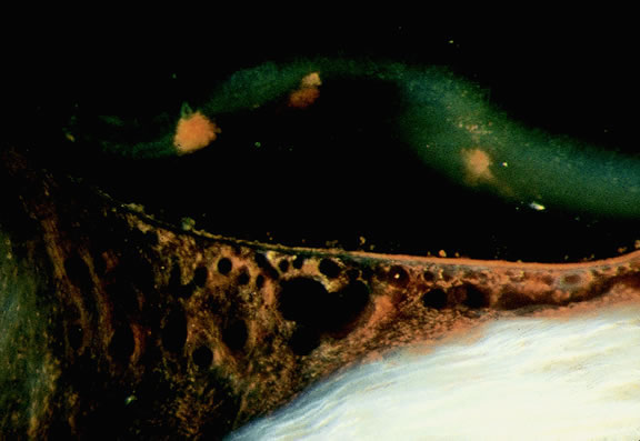 A variant of CHRPE is congenital grouped pigmentation (“bear tracks”).277 Recently, multiple bilateral pigmented RPE lesions that bear a superficial resemblance to CHRPE were reported as an ocular marker for the heritable cancer diathesis Gardner's syndrome (familial adenomatous polyposis with extracolonic manifestations).278,279 CHOROIDAL OSTEOMA Choroidal osteoma is a benign tumor composed of bone, which usually is found in young women.48,280 It may be unilateral or bilateral and may occur in siblings.281 Choroidal osteoma appears clinically as a yellow-orange placoid tumor with sharply defined scalloped margins (Fig. 75). It typically is located next to the optic disc or in the macula. Osteomas may enlarge,282 become decalcified,283,284 undergo spontaneous involution,285 or develop choroidal neovascularization.48 Osteomas may be confused ophthalmoscopically with metastases but are easily distinguished by ultrasonography, which shows a highly reflective plaque that persists at lower sensitivity, or by computed tomography that reveals a plaque with bone density. Serum calcium, phosphorus, and alkaline phosphatase levels usually are normal. The visual prognosis is unpredictable.286 Only a single case of choroidal osteoma has been examined histopathologically.287 A plaque of mature bone was found within the stroma of the choroid (Fig. 76). In contrast, bone is found on the inner surface of Bruch's membrane in osseous metaplasia of the retinal pigment epithelium, which is a relatively common occurrence in phthisical eyes with chronically detached retinas.