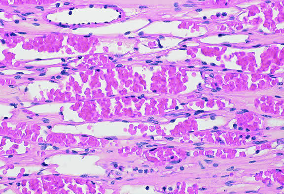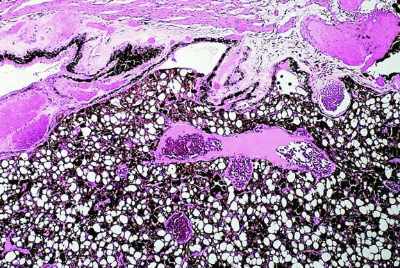 Choroidal hemangiomas are benign vascular hamartomas composed of relatively large, thin-walled vascular channels lined by endothelial cells (Fig. 59). Based on the size of the vascular channels, choroidal hemangiomas have been classified as cavernous, capillary, or mixed. In contrast to cavernous hemangiomas in the orbit, choroidal hemangiomas are relatively devoid of stroma. They lack the thick fibrous septa found in the orbital lesions and the individual vascular channels almost appear to abut each other. Solitary tumors have clearly demarcated pushing margins that cause compression of adjacent melanocytes and choroidal lamellae.228 Patients with Sturge-Weber syndrome have a diffuse angiomatosis that involves more than half of the choroid and shows intermixture of engorged preexisting vessels with the vascular tumor.