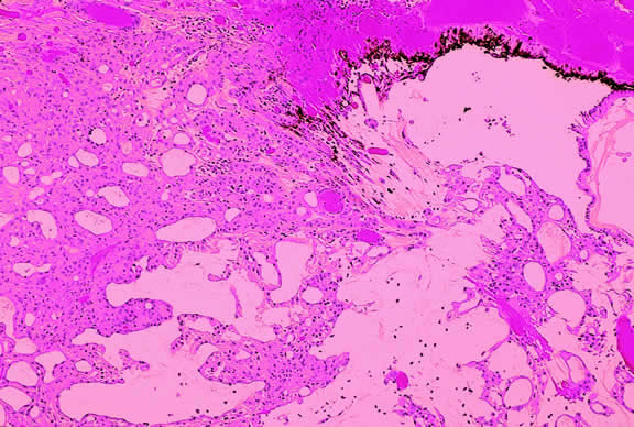 Primary acquired neoplasms occasionally arise from the retinal pigment epithelium and iris pigment epithelium and the pigmented and nonpigmented epithelia of the ciliary body. All of these layers are derived embryologically from the neuroectodermal optic cup. These neuroectodermal tumors include adenomas and adenocarcinomas. Adenomas of the iris pigment epithelium are sharply demarcated black tumors that push aside, rather than infiltrate, the iris stroma (Fig. 64). The cytoplasm of these exceedingly rare tumors contains large round pigment granules.261 Ciliary epithelial tumors (Figs. 65 to 69) can be predominantly pigmented or nonpigmented. Small pseudoadenomatous proliferations of the nonpigmented ciliary epithelium called Fuchs' or coronal adenomas are a common incidental finding in older adult eyes262,263 (see Figs. 65 and 66). The cytoplasm of many pigmented ciliary epithelial tumors contains multiple small cystoid spaces264 (see Fig. 67). Nonpigmented tumors are white or yellowish white in color and often produce focal cataract or lens dislocation. Many contain pools of hyaluronic acid, which can be extensive in some cases265 (see Figs. 68 and 69). In contrast to melanoma, which arises from the uveal stroma, ciliary epithelial tumors arise from the epithelium lining the inner surface of the ciliary body. Local resection usually is curative. Many ciliary epithelial tumors are benign, but malignant variants have been reported.265–271 Invasion, mitotic activity, and nuclear pleomorphism are signs of malignancy.
