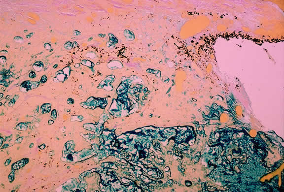 Choroidal melanomas produce abnormalities in the overlying retinal pigment epithelium including atrophy, hyperplasia, and the formation of drusen and drusenoid material.92 The overlying retina often shows photoreceptor loss and may develop cystoid edema. The latter tends to be more common in slower growing lesions, especially choroidal hemangiomas. After Bruch's membrane has ruptured, the vessels located in the mushrooming head of the tumor are often quite prominent, reflecting vascular stagnation caused by the compression at the waist of the tumor (see Fig. 22). Aggregates of macrophages that have ingested periodic acid-Schiff (PAS)-positive lipofuscin pigment and melanin from the damaged retinal pigment epithelium can be found in the subretinal fluid (Figs. 39 to 41). These are evident ophthalmoscopically as clumps of orange pigment that serve as a clinical marker for an actively growing neoplasm.80,81
