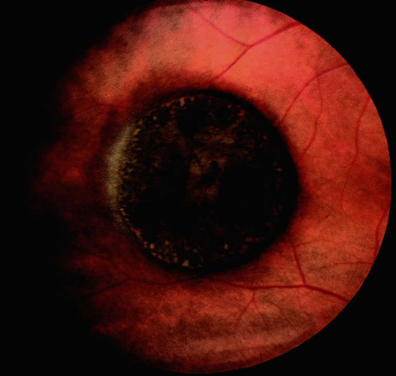 Choroidal melanomas are classified as small, medium, or large based on the largest tumor diameter (LTD). Small choroidal melanomas are 10 mm in diameter or less and appear as focal discoid or oval areas of choroidal thickening. Medium-sized melanomas measure 11 to 15 mm, and large tumors are more than 15mm in largest basal tumor diameter. Larger tumors are more likely to have ruptured through Bruch's membrane. In the COMS, medium-sized tumors were located more posteriorly than large tumors.84 Presumably, more anteriorly situated ciliary body tumors are larger when they are first detected because they remain hidden behind the iris, cause late retinal detachment, and hence remain asymptomatic. Ciliary body melanomas (Figs. 27 to 29) are less common than choroidal melanomas and tend to be more spherical in shape. As noted previously, ciliary body melanomas can cause unilateral cataract, lens molding, or subluxation (see Fig. 28). In addition to causing secondary glaucoma by angle seeding or circumferential infiltration, ciliary body melanomas that invade the periphery of the anterior chamber often displace the iris root centrally causing a solid iridodialysis. Heterochromia iridum also is possible if there is extensive chamber seeding. Ciliary body tumors that perforate the iris initially may be misdiagnosed as a small iris tumor that in reality is the “tip of an iceberg” (see Fig. 29).