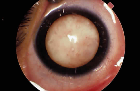 Strabismus or ocular misalignment occurs in about one third of cases and may herald a relatively small tumor that involves the fovea. For this reason, careful ophthalmoscopy should be performed in all children with strabismus to exclude retinoblastoma or some other significant retinal pathology. About half of the eyes enucleated for retinoblastoma have iris neovascularization, which may produce neovascular glaucoma, iris heterochromia, and even secondary buphthalmos. Pupillary block glaucoma caused by anterior displacement of the lens-iris diaphragm may be found in eyes with exophytic tumors and total retinal detachments. Endophytic tumors and the rare diffuse infiltrating variant of the disease often seed the anterior chamber, forming a pseudohypopyon of tumor cells that may be initially misdiagnosed as inflammation. An orbital cellulitis-like picture is another type of pseudoinflammatory presentation. In such cases, histopathologic examination usually reveals severe neovascular glaucoma that has caused extensive infarction of the tumor and other intraocular structures. In underdeveloped countries, patients may present in the late stages of the disease with a tumor that has extended extraocularly, causing exophthalmos and an orbital mass. Rare tumors are manifest at birth. Congenital retinoblastoma may present with a massive hyphema and an enlarged ectatic cornea that spontaneously perforates (Fig. 5).