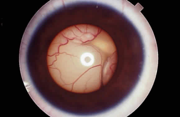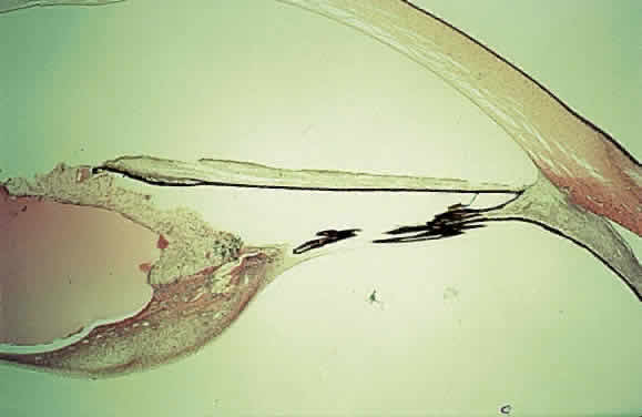 Coats' disease usually is unilateral, and two thirds of cases occur in boys. Although most cases are diagnosed in the second half of the first decade (age 4 to 10 years), the disease can affect children between 18 months and 18 years. Macroscopically, enucleated eyes with Coats' disease have a high bullous retinal detachment that typically abuts the back surface of the lens and ciliary body (see Fig. 22). The lens-iris diaphragm is displaced anteriorly, causing secondary closed-angle glaucoma via a pupillary block mechanism. The yellow, gelatinous subretinal fluid contains glistening crystals of cholesterol. Rarely, the lipid-rich subretinal fluid enters the anterior chamber through defects in the retina and anterior vitreous. Histopathologically, parts of the inner retina contain an increased number of large telangiectatic vessels. The outer retinal layers are massively thickened by exudates, which appear as pools of eosinophilic and transudate positive for periodic acid-Schiff (see Fig. 23). The densely proteinaceous and lipid-rich subretinal fluid contains aggregates of foamy histiocytes and empty clefts that contained free, rhomboidal, crystals of cholesterol that were dissolved by lipid solvents during processing (see Fig. 24). RETINOPATHY OF PREMATURITY Organization or fibrosis of the vitreous (e.g., cyclitic membrane formation), which may lead to tractional retinal detachment, occurs in several conditions that simulate retinoblastoma, including retinopathy of prematurity (ROP). The term retrolental fibroplasia, originally applied to this largely iatrogenic disorder, emphasizes the causal role of vitreous organization in the tractional retinal detachment that complicates its final stages. ROP usually is bilateral and rarely is present at birth, two features it shares with retinoblastoma. Classically, ROP develops in premature infants who have received supplemental oxygen therapy. Infants weighing less than 1500 g at birth and those born at a gestational age of less than 32 weeks are at risk for developing ROP. However, occasional cases have been reported in full-term infants and in premature infants who did not receive oxygen therapy. Vascular proliferation and secondary vitreous fibrosis are thought to result from the effect of increased oxygen levels on the immature, incompletely vascularized retina. ROP typically arises in the temporal quadrant of the retina, because the temporal retina usually is not completely vascularized at term, especially in premature infants. Experiments performed in newborn kittens suggest that excessive oxygen induces transient vasoconstriction, subsequent dilatation, and ultimately vaso-obliteration of immature retinal vessels. Electron microscopic studies suggest that retinal neovascularization in the human may be a response of the vanguard of primitive, vasoformative spindle cells in the nonvascularized peripheral retina to elevated oxygen levels or, perhaps, diminished levels of vitamin E. Increased numbers of intercellular gap junctions between vasoformative cells have been observed in vitamin E-deficient infants who subsequently developed ROP. The role of this natural antioxidant compound in the causation and therapy of ROP remains controversial. In the early active stages of ROP, a band of glomeruloid capillaries proliferates at the junction between the peripheral nonperfused and the posterior perfused retina. The proliferating vessels break through the internal limiting membrane and invade the vitreous, inciting fibrosis and contraction. In the later cicatricial stages of ROP, the retina is folded on itself by the organized vitreous, forming a fibroneural mass that drags the macula and optic disc temporally (Fig. 25). The end stage of the disease is marked by total retinal detachment, leukocoria, blindness, and phthisis bulbi. RETINAL DETACHMENT Retinal detachment in childhood can be confused with retinoblastoma, and vice versa. The possibility of an underlying retinoblastoma should always be considered when a child presents with retinal detachment and vitreous hemorrhage, even when a history of trauma is obtained. Appropriate preoperative studies (ultrasonography or computed tomography) are indicated; if vitrectomy is performed, the specimen should be submitted for cytologic examination. The clinician must recall that retinoblastoma occasionally presents in older children, who may have the diffuse infiltrative form of the tumor that typically does not cause a discrete tumefaction or leukocoria. In addition, retinoblastoma (or another intraocular malignancy such as medulloepithelioma) must be ruled out in any infant or child with neovascular glaucoma. Neovascular glaucoma in a child is retinoblastoma until proven otherwise. In addition, the ophthalmologist always should recall the association between retinal detachment and child abuse. INCONTINENTIA PIGMENTI Peripheral vascular abnormalities, which are believed to cause secondary retinal detachment and leukocoria, occur in females who have incontinentia pigmenti or the Bloch-Sulzberger syndrome. This rare multisystem disorder has an X-linked dominant inheritance; normal males die in utero, but the disorder has been reported in males with Klinefelter's syndrome (XXY). Affected female infants develop vesiculobullous skin lesions on the trunk and extremities at birth or shortly thereafter. The bullae contain many eosinophils, and systemic eosinophilia is often present. The term incontinentia pigmenti refers to the incontinence, or loss, of melanin from epidermal basal cells. The pigment collects in the dermis as free granules or as aggregates of melanophages. Clinically, the affected skin has a characteristic marbleized or whorllike pattern of pigmentation. Other manifestations of the syndrome include alopecia, dental anomalies (late dentition, absent or misshapen teeth), and central nervous system abnormalities (seizures, mental retardation). Ocular findings occur in approximately one third of pat