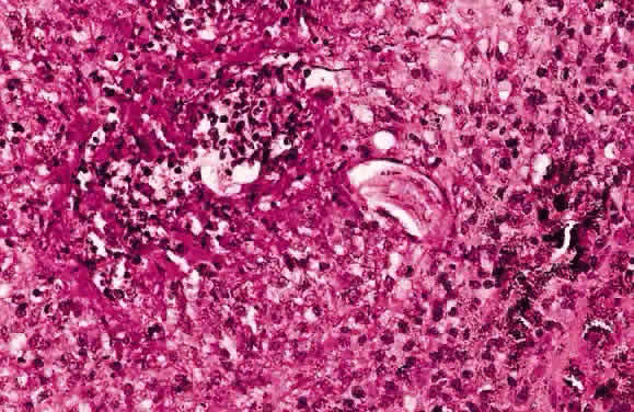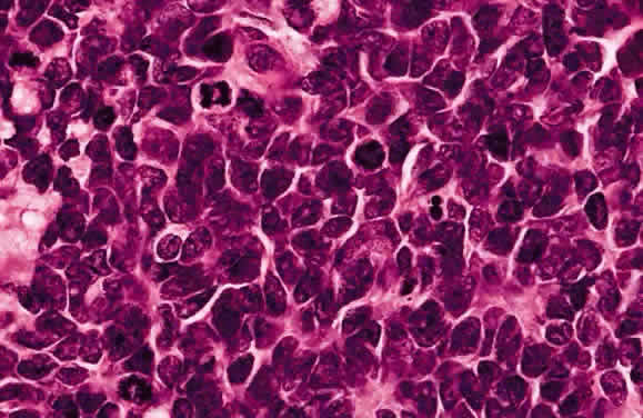 foci (Fig. 14). Viable parts of a retinoblastoma appear blue because they are composed of poorly differentiated neuroblastic cells that have scanty cytoplasm and intensely basophilic nuclei (Fig. 15). Many mitoses and fragments of apoptotic nuclear debris usually are present. Retinoblastoma grows rapidly and has a marked propensity to outgrow its blood supply and undergo spontaneous coagulative necrosis. This usually occurs when the proliferating cells have extended about 90 to 110 μm away from a blood vessel (see Fig. 15). The necrotic tumor cells lose their basophilic nuclear DNA and become pink or eosinophilic. The residual viable cells typically form cuffs or sleeves around vessels, imparting a multilobulated or papillary appearance to some tumors. These perivascular cuffs were called pseudorosettes by some in the past. Foci of dystrophic calcification develop in the necrotic parts of the tumor in many cases. Histopathologically, the calcific foci appear reddish-purple in hematoxylin-and-eosin sections, and the presence of calcium can be confirmed by the von Kossa or alizarin red stains. Electron microscopy suggests that calcification probably begins in the mitochondria of necrotic cells. Clinically, the demonstration of calcification by ultrasonography or computed tomography can help to differentiate retinoblastoma from other simulating lesions. Intensely basophilic deposits of DNA released from necrotic tumor cells are another characteristic histopathologic feature of retinoblastoma. DNA deposition generally is found in eyes with extensively necrotic tumors. Typically, the DNA deposits surround retinal or iris vessels or are found in the trabecular meshwork or in basement membranes such as the lens capsule or the internal limiting membrane of the retina. |