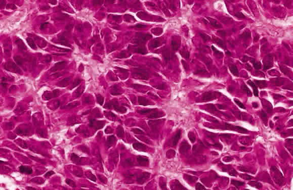 Fleurettes, described by Ts'o, Zimmerman, and Fine in 1970, are aggregates of neoplastic photoreceptors that represent a greater degree of retinal differentiation (Fig. 18). Found in approximately 6% of cases, fleurettes typically occur in a viable area of tumor that appears less cellular and relatively more eosinophilic than adjacent undifferentiated retinoblastoma during low-magnification microscopy. The term “fleurette” denotes a bouquet-like arrangement of cytologically benign cells joined by a series of zonulae adherentes that may form a short segment of neoplastic external limiting membrane. Bulbous eosinophilic processes that represent abortive photoreceptor inner segments form the “flowers” of the bouquet. Electron microscopy occasionally discloses stacks of cellular membranes representing early outer segment differentiation. The demonstration and characterization of photoreceptor differentiation firmly established that retinoblastoma is not a glioma of the retina and affirmed that the adoption of that name by the American Ophthalmological Society in 1926 at Frederick Verhoeff's suggestion was indeed appropriate. Foci of photoreceptor differentiation are found more frequently (40% of cases) in eyes that are enucleated after radiotherapy or chemoreduction. Presumably, the chemo- or radiotherapy kills the malignant part of the tumor and discloses the benign foci, which are relatively radio- or chemoresistant. Retinal tumors composed entirely of fleurettes are thought to be a benign variant of retinoblastoma that is incapable of metastasis. Such tumors are called retinocytomas (see above). Compared to retinoblastoma, the cells composing retinocytoma are quite bland, and mitotic activity is uncommon. In addition, calcification occurs in viable parts of retinocytomas. Retinoblastoma is thought to be derived histogenetically from primitive retinal cells that are capable of differentiation into both neuronal and glial elements. Immunocytochemical studies of retinoblastomas have demonstrated cells that are immunoreactive for either photoreceptors or the giant glial cells of Mueller. Although the actual cell of origin is uncertain, there is evidence that retinoblastoma could be derived from photoreceptors. |