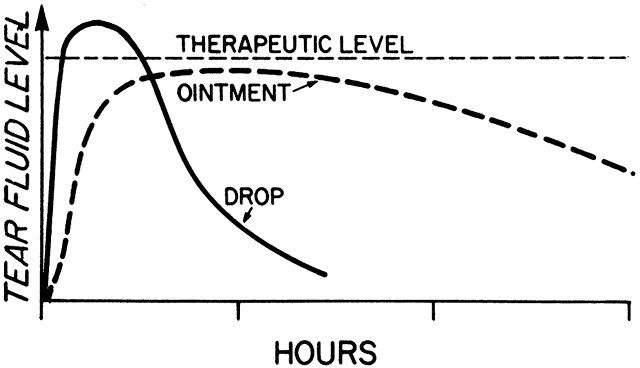 SURFACTANTS. Detergents are added to ocular solutions for several reasons: they increase the solubility of drugs that are relatively hydrophobic; they may act as preservatives because of their antibacterial activity; or they may be added for their ability to partially break down the barrier presented by the corneal epithelium, thereby enhancing drug penetration and bioavailability. Benzalkonium chloride is the detergent most commonly used as a preservative in ophthalmic solutions. It is a cation and usually used in low concentrations (e.g., 1/10,000). If concentrations of 1/3000 or stronger are used repeatedly, there is significant protein denaturation. This is because the positively charged benzalkonium interacts with the negative charges on the amphoteric corneal proteins. It also interacts with anions such as fluorescein and sulfonamides and is therefore incompatible.43 Smolen and coworkers44 reported that the bioavailability of carbachol was enhanced significantly in the presence of 1/5000 benzalkonium chloride. Rabbits given a 0.1% carbachol solution with 1/2500 benzalkonium chloride obtained as much miosis as if given a 2% carbachol solution without surfactant. Tonjum45 has used the electron microscope to study the effect of benzalkonium chloride on rabbit corneal epithelium. He found that this surfactant broke down the tight junctions of the epithelial cells and allowed penetration of horseradish peroxidase. Similar increases in drug penetration have been reported by others using this and other (e.g., cetyl pyridinium chloride) ionic detergents.46–50 OSMOTICS. Agents may be added to ophthalmic solutions to adjust their tonicity to that of tears, 0.9% sodium chloride.51 If the tonicity deviates too far from this value, the pain produced evokes a reflex tearing that washes the drug from the eye. The range of acceptable tonicities for comfort appears to be wide. Riegelman and coworkers52 found that volunteers did not complain of discomfort when sodium chloride concentrations from 0.5% to 2% were instilled. It is not known whether awareness of pain is needed to evoke increments in reflex tearing, however. ANTIOXIDANTS. The oxygen in the atmosphere can oxidize many drugs (e.g., phenylephrine and epinephrine) to inactive molecules.53 Bisulfite is an antioxidant that has been added to epinephrine solutions to prevent degradation, yet bisulfite reacts with epinephrine to form 1-(3,4-dihydroxyphenyl)-2-methylaminoethanesulfonic acid.54 The presence or absence of antioxidants can thereby alter the therapeutic efficacy of different epinephrine preparations. Haddad and coworkers55 noted that 10% phenylephrine commercial solutions had a potency equivalent to freshly prepared solutions of 1% to 5% phenylephrine. AGING. If the same drug were prepared as both an ocular solution and an oral tablet, the former would be most likely to have aging problems. Drugs tend to be less stable in water. One reason is that water can react with several drugs directly. Pilocarpine can be hydrolyzed to an inactive form, as can the local anesthetics and all of the phosphorylating (e.g., echothiophate) and carbamylating (e.g., physostigmine) cholinesterase inhibitors. Oxygen may also react more readily with drugs in solution; for example, catechols such as epinephrine are oxidized to adrenochrome. Impurities in the glass or plastic container may slowly be leached into the solution with time. These impurities (e.g., polymerization residues, plasticizers, pigments, and lubricants) may alter the drug structure or the physical characteristics of the drug solution. Chloramphenicol eye drops are sold in opaque or heavily tinted—usually amber—containers. This reduces photochemical decomposition from light wavelengths of 285 mm or longer.56 Exposure of an unprotected 0.25% chloramphenicol solution for four minutes to sunlight equivalent to that of a normal summer day decomposes 8% of the drug to p-nitrobenzaldehyde. The presence or absence of a mercuric preservative is not a factor. Such decomposition may affect drug toxicity and efficacy: it has long been proposed that nitroso breakdown products of chloramphenicol are the cause of its associated aplastic anemia. Although not the subject of this chapter, it is interesting to speculate what may be happening to chloramphenicol within the aqueous humor—whether absorbed from topical application or oral ingestion—while the well-medicated patient sits reading in a brightly lit room. Drop Volume The size of the eye drop is a bioavailability factor with easily recognizable economic implications. When the eye-drop volume exceeds that which can be retained by the lids and conjunctival sac, the excess fluid runs down the face. The ocular bioavailability of the overflow is zero. Drop size is not only a function of the bottle tip or dropper design but also of the viscosity and temperature of the solution and the angle at which the bottle is held.57 For example, the greater the viscosity, the larger the drop volume. These factors resulted in one timolol preparation being delivered in drops of 28 μl average size and levobunolol in 46-μl drops.58 To address the effect of tip of manufacturing, the bottles were refilled with saline; the respective average volumes of the timolol and levobunolol drops became 48 and 55 μl. A different situation exists if the drop volume is less than the maximum that can be held by the lids. A single 5-μl drop of 0.5% tropicamide was a less effective mydriatic than a 16-μl drop.59 This deficiency was overcome, however, by increasing the drug concentration in the micro drop (e.g., to 1%). Suspensions are saturated solutions of a drug in which excess molecules, unable to enter solution, exist as small particles or crystals. These particles represent a drug depot. For this depot to be useful, however, it must enter solution. This can occur in two ways: either by increasing the water volume of the solution or by removing the drug in solution. If the 