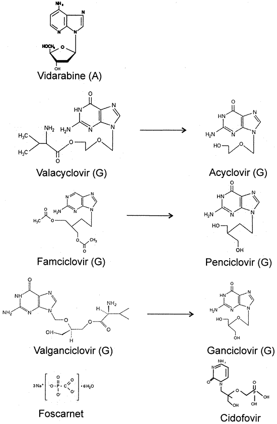 | Ganciclovir (DHPG; 9-[1,3-dihydroxy-2-propoxymethyl] guanine) was the first drug to be approved