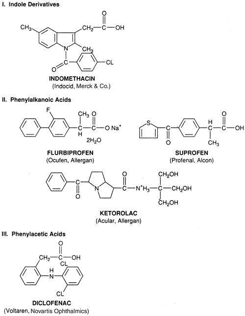 Most NSAIDs are weak acids with pKa values between 3 and 6. The unionized form of the molecule is associated with good lipid solubility providing good absorption from the stomach, upper gastrointestinal tract and permitting passage through the lipoidal corneal epithelium of the eye. Generally, pKa values are lower than the respective pH values of the extracellular environment, and, therefore, these drugs exist largely in their ionized forms. However, in a more acid environment, such as that produced by inflammation, the unionized form of drug is available to diffuse into cells. A pH change from 7.4 to 7.0 is accompanied by a 25% increase in the unionized form of the drug. Because the intracellular pH decreases less than the extracellular pH during an inflammatory process, the relatively alkaline environment provided inside the cells favors the ionized form of the drug trapping it within the cell. Thus, the pH difference favors increasing the NSAID intracellular concentration potentially enhancing therapeutic effects.7 The chemical structures of all of the NSAIDs incorporate at least one aromatic ring. The structures of indomethacin, diclofenac, and flurbiprofen include two aromatic rings that are twisted with respect to each other. A study of structure–activity relationships has helped determine the characteristics of at least one NSAID receptor.8 However, there are undoubtedly multiple receptors for NSAIDs with different structural requirements. Therefore, it is unlikely that the characteristics of any single proposed receptor as determined in vivo will explain the pharmacologic activity of this group of drugs. Indomethacin is the first topically administered NSAID that found widespread use in ophthalmic clinical studies. However, it remains unapproved for use as an ophthalmic formulation in the United States. From a chemical viewpoint, it is the only indole derivative available. This drug is chemically known as 1-(4-chlorobenzoyl)-5-methoxy-2-methyl-1H-indole-3-acetic acid with the empirical formula of C19H16ClNO4 and a molecular weight of 357.80. Indomethacin is soluble in alcohol but insoluble in water. Initially, it was formulated in a solution of sesame seed oil.9 However, this eyedrop proved too irritating for patients. Therefore, the preparation currently available commercially in Europe and other parts of the world is a 1% indomethacin aqueous suspension (Indocid Ophthalmic Suspension; Merck, Sharpe & Dohme, West Point, PA). The phenylalkanoic acids are water-soluble and, consequently, are easier to formulate as ophthalmic solutions. Flurbiprofen 0.03% (Ocufen Ophthalmic Solution; Allergan, Irvine, CA) and suprofen 1% (Profenal Ophthalmic Solution; Alcon, Ft. Worth, TX) are approved by the FDA for inhibition of intraoperative miosis. However, only flurbiprofen is commercially available. Flurbiprofen is chemically known as sodium (+/-)-2-fluoro-α methyl-4-biphenyl acetate dehydrate with a molecular weight of 302.3. Suprofen is α-methyl-4-(2-thienylcarbonly) benzene acetic acid with the empirical formula of C14H12O3S and a molecular weight of 260.3. It has not been available commercially for several years. The third phenylalkanoic acid derivative, ketorolac tromethamine, is currently available as three different commercial preparations: the first approved 0.5% ophthalmic solution (Acular; Allergan), a preservative free 0.5% solution (Acular PF; Allergan) and a lower strength 0.4% ophthalmic solution (Acular LS; Allergan). Acular Ophthalmic Solution is approved for the treatment of postoperative inflammation in patients who have undergone cataract extraction and for the temporary relief of ocular itching caused by seasonal allergic conjunctivitis. Acular PF is indicated for the reduction of ocular pain and photophobia following incisional refractive surgery. Acular LS is approved for the reduction of ocular pain and burning/stinging following corneal refractive surgery. All of these preparations contain the same basic drug molecule ketorolac as a tromethamine salt and is known chemically as (+/-5-benzoyl-2,3-dihydro-) 1H-pyrrolizine-1-carboxylic acid with 2-amino-2-(hydroxymethyl)-1,3-propanediol(1:1). The molecular weight is 376.41 with the empirical formula of C19H24N2O6. It is formulated as tromethamine salt to provide ideal water solubility. Ketorolac exists as both S (−) and R (+) enantiomers and is marketed as the racemate. The S (−) enantiomer is approximately twice as active as an anti-inflammatory agent. Interestingly, and unlike other NSAIDs, the S enantiomer of ketorolac is levorotatory. Ketorolac's enantiomers exhibit stereoselective pharmacokinetics.10 Diclofenac sodium 0.1% (Voltaren; Novartis Ophthalmics, East Hanover, NJ) is a phenylacetic acid derivative that is approved for use by the FDA after cataract surgery to inhibit postoperative inflammation and for the relief of pain and photophobia following refractive surgery. It is designated chemically as 2-((2, 6-dichloro-phenyl) amino) benzene acetic acid, monosodium salt, with an empirical formula of C14H10Cl2NO2. Its molecular weight is 318.14. It is freely soluble in methanol and sparingly soluble in water. This ophthalmic solution has the faint odor of castor oil. |