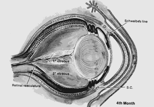 Abnormalities of the lens that occur during the stage of differentiation include alterations in size (e.g., microspherophakia), in shape (e.g., anterior and posterior lenticonus), and in the lens fibers themselves (e.g., developmental cataracts). The developing lens receives its blood supply from multiple branches of the hyaloid artery. These cover the anterior and posterior aspect of the lens and anastomose with vessels within the mesenchyme tissue that covers the lens, forming the pupillary membrane. This hyaloidal vascular system is called the tunica vasculosa lentis. Its greatest development occurs at 9 weeks' gestation, starts to regress by the end of the third month, and is usually complete by the eighth month. Failure of this system to regress leads to a persistent pupillary membrane. Mittendorf's dot is also a failure of complete regression and represents that part of the hyaloid artery that attached to the posterior lens capsule. RETINAL DIFFERENTIATION When the optic vesicle collapses, the neural ectoderm folds onto itself to produce the optic cup, which has a double layer of neural ectoderm. The optic cup will differentiate into the neurosensory retina (inner layer of neural ectoderm) and retinal pigment epithelium (outer layer). Further development of the sensory retina may be divided into four stages of progressive differentiation: the initial differentiation into zones, the organization into temporary layers, the migration and differentiation of cells, and the final organization of layers. Disorganized differentiation may result in the histologic picture of retinal dysplasia.7 VITREOUS DIFFERENTIATION The primary vitreous forms between the inner layer of the optic cup and the developing lens at approximately 6 weeks. The secondary vitreous is derived from the retina and surrounds the primary vitreous. It is composed of very fine, densely packed fibrils that are arranged in an orderly manner at right angles to the retinal surface. Condensation of the fibrils forms the walls of the canal of Cloquet, which is a conduit for the hyaloid artery. The hyaloid artery supplies the vascular network surrounding the lens. At the end of the third month, the hyaloid artery atrophies and retracts with the primary vitreous to form a narrow and constricted zone in the central vitreous cavity (Figs. 2 and 3). The atrophy begins centrally and proceeds anteriorly and posteriorly. Incomplete atrophy may result in anterior hyaloid remnants associated with the lens or in posterior remnants associated with the optic nerve head. An example of an anterior remnant is Mittendorf's dot. Bergmeister's papilla may be considered a posterior remnant of the hyaloid system.