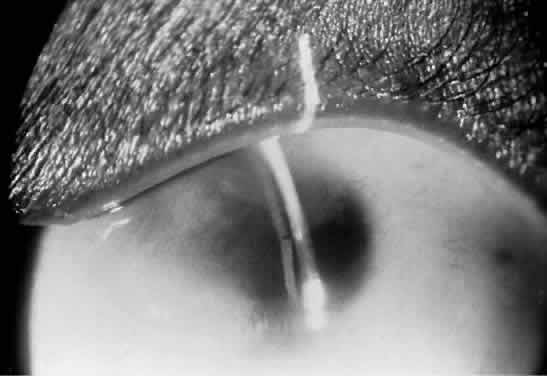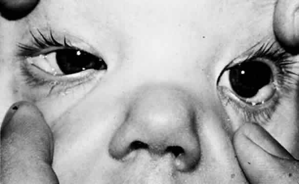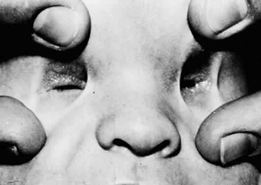 ANKYLOBLEPHARON Ankyloblepharon is characterized by fusion of the lid margins over a portion of their length, producing a shortening of the palpebral fissure.4 Most commonly, the lids are fused at the outer canthus (external ankyloblepharon); more rarely, the inner canthus is involved (internal ankyloblepharon). Both internal and external ankyloblepharon probably result from faulty or incomplete lid separation in the sixth or seventh month of fetal development.4 Although ankyloblepharon is usually a sporadic finding, an autosomal-dominant transmission has been reported. CONGENITAL NASOLACRIMAL DUCT OBSTRUCTION Obstruction of the nasolacrimal duct is seen in approximately 2% to 4% of otherwise normal infants. Symptoms may include excessive tearing and recurrent or persistent conjunctivitis and dacryocystitis. Congenital nasolacrimal duct obstruction is thought to be caused by a failure of the column of epithelial cells that form the nasolacrimal duct to canalize completely. The most common site of obstruction is at the mucosal entrance into the nose under the inferior turbinate (valve of Hasner).217 |