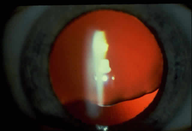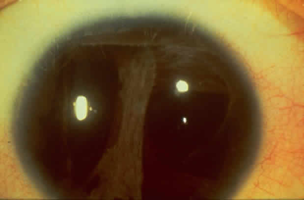 PAX6 has been identified on chromosome 11p13.46,111–113 This gene contains 14 exons, is transcribed as a 2.7-kb mRNA, and encodes a 422-amino-acid protein. PAX6 may function as a transcriptional factor in regulating expressions of other genes in embryogenesis.112 Such an important role for PAX6 as the master control for gene expression in oculogenesis may explain the panocular manifestations in patients with aniridia. Aniridia and PAX6 have provided a valuable model system in the study of molecular mechanisms important in the embryogenesis of the eye. Clinically, prenatal diagnosis can be carried out to detect PAX6 mutations in amniocytes.112 Such detection requires prior characterization of a PAX6 mutation in the family of the proband. In patients with the sporadic form of aniridia, it is important to detect deletions of chromosome 11p13 and the Wilms' tumor locus because these patients may have a 50% risk of Wilms' tumor development. Typically, karyotypes are examined and patients followed up with renal ultrasound. Molecular techniques are becoming available for direct detection of the number of copies of aniridia and Wilms' tumor genes in patients with aniridia, thereby offering a genetic test for the predisposition to Wilms' tumor.114–117 AXENFELD-RIEGER SYNDROME Axenfeld-Rieger syndrome consists of bilateral congenital abnormalities of the anterior segment of the eye associated with abnormalities of the teeth, midface, and umbilicus. Ocular findings include prominent, anteriorly displaced Schwalbe's line (posterior embryo toxon), peripheral iris strands extending to Schwalbe's line, and iris thinning with atrophic holes (Fig. 4). Axenfeld-Rieger syndrome is typically inherited as an autosomal-dominant disorder,118 but 25% of cases are sporadic. There is no sex predilection. Cytogenetic studies have mapped the Axenfeld-Rieger locus to chromosome 4q25.119–123 Based on these linkage studies, a candidate gene located in this chromosomal region that encodes for epidermal growth factor (EGF)124–128 has been chosen. The EGF gene is considered an excellent candidate gene because EGF binds to the tooth, and antibodies to EGF inhibit dental and eye development.125–127 Antisense oligonucleotides to EGF have been shown to block tooth formation in vitro.129 In addition, Raymond and co-workers126 and Jumblatt and associates130 have shown that the corneal endothelium has EGF receptors and undergoes morphologic changes when exposed to EGF.130 However the hypothesis that EGF is the Axenfeld-Rieger gene is yet to be proved because no causative mutations in EGF have been identified to date in patients with Axenfeld-Rieger syndrome. Alternative candidate genes in this chromosome 4q25 region are still being sought.124 CATARACT Hereditary cataract can be transmitted as an autosomal-dominant131 or X-linked trait and can be associated with other ocular findings (e.g., microphthalmia, microcornea) and systemic manifestations (e.g., dental anomalies).96,131–134 The lens opacity is often central in X-linked congenital cataract (Fig. 5). Using RFLP, the locus for X-linked congenital cataract has been mapped to chromosome Xp21.1-22.3.135–137 Many other chromosomal loci have been described for various other types of cataract, including Coppock-like cataract (chromosome 2q33-35),138 Mariner-type cataract (chromosome 16q22),139,140 anterior polar cataract (chromosome 2p25, 14q24,141 and congenital total cataract (chromosome Xp).142,143